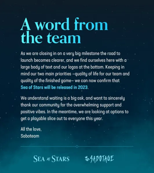 While the delay is a bummer, we appreciate the team’s respect for the employee’s work/life balance and strive for quality. The idea of getting a demo this year is certainly enticing too, as Sea of Stars has looked phenomenal every time it’s made an appearance.