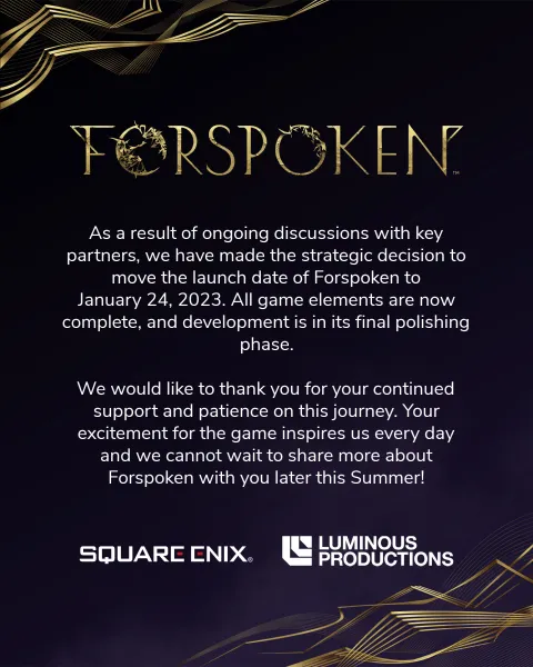 In a post on the game’s Twitter page, developer Luminous Productions, a team made up of Final Fantasy XV developers, states that Forspoken is largely complete and is in the final polishing phase. It describes the delay as a “strategic decision” and that we’ll learn more about the game in the near future.