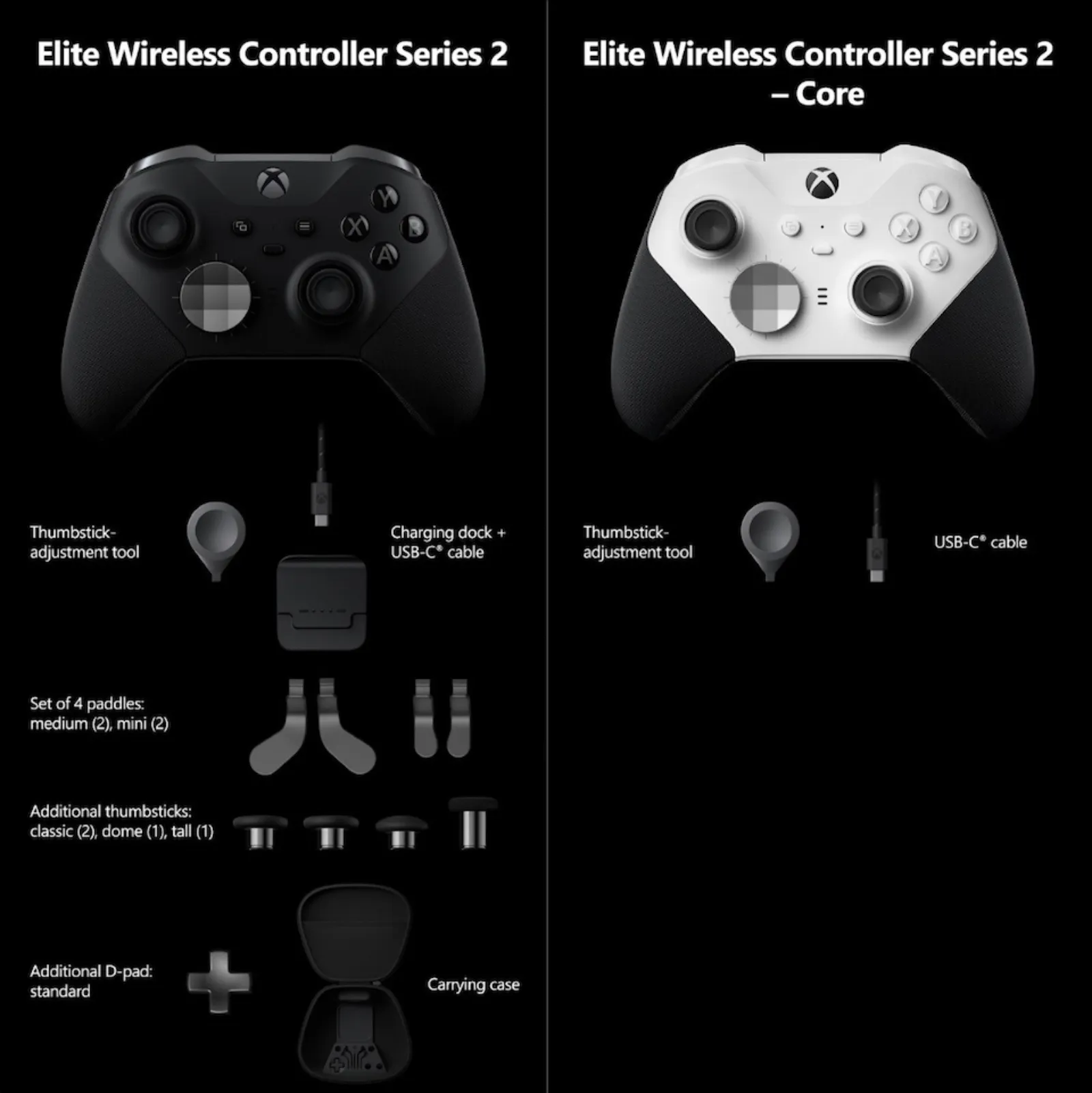 As you can see, the Core controller does not include a charging dock, the four back paddles, the additional thumbstick and d-pad, or the carrying case. However, you can add these accessories to the Core controller by purchasing the Complete Component Pack separately for $59.99. These accessories can be used on both the Core controller and as replacement parts for your current Elite Series 2 controller.