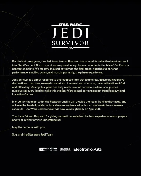 Respawn Entertainment has delayed Star Wars Jedi: Survivor, but thankfully the wait won’t be terribly long. Instead of arriving on March 17, the game will now launch a little over a month later on April 28.