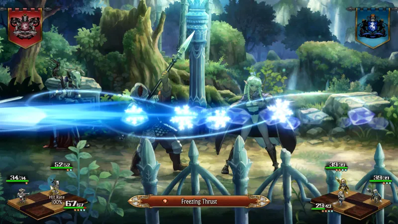 After a few fights in this preliminary stage early in the game’s opening hours, we liberate a Palevian town under Zenoira, switching it from a red flag to our blue flag, picking up two Valor points in the process. This newly liberated town is now a base from which we can deploy units. We advance through the stage, using Josef to cover extra ground as movement takes place in real time, and he moves the fastest, while swapping allies in and out of various units once two units are within the radius of a special green circle on the tactical battle map. Vanillaware says it’s essential to take advantage of this feature, as damaged allies might need to fall back while more adept ones, like a companion that uses magic (or magick as it’s called in the game), or another with high stamina indicated by the number on an on-screen shield, head to the front of a unit’s pack.