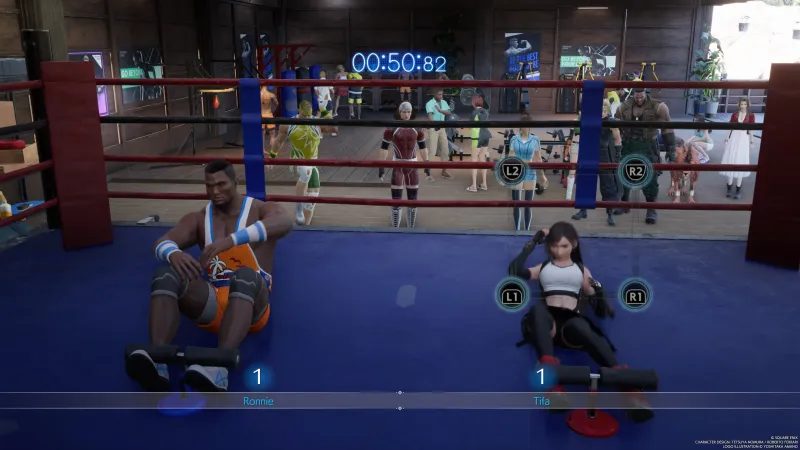 Getting challenged to a sit-up competition may not sound like a ton of fun, but Rebirth puts a unique twist that borders on a rhythm game. Hitting buttons in time with a rotating meter is simple enough, but once the inputs fade, it becomes a matter of hitting the specific button at the right time to prevent yourself from falling and wasting precious time. It's not one we felt compelled to revisit after the sidequest requiring us to compete, but we had a good enough time making Tifa do more crunches than the woman at the gym who looks up to her.