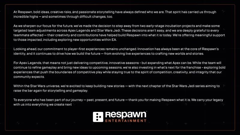"These decisions aren’t easy, and we are deeply grateful to every teammate affected – their creativity and contributions have helped build Respawn into what it is today. We’re offering meaningful support to those impacted, including exploring new opportunities within EA."