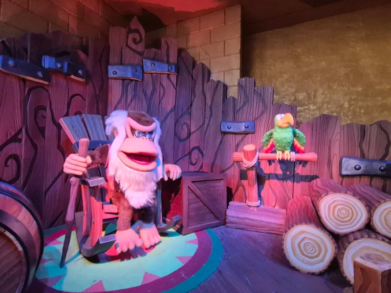 Having ridden the kid-friendly Yoshi’s Adventure and AR-centric Mario Kart: Bowser’s Challenge in the main area, Mine Kart Madness is easily my favorite attraction in all of Super Nintendo World. As the line takes players through a golden interior filled with primate statues and wall paintings, you eventually encounter an impressive animatronic of Cranky Kong, who regales visitors about a stolen golden banana caper to his parrot, Squawks. It’s strange hearing Cranky speak English instead of his usual shrill grunts, but it was cool to see a presumably life-sized version of the OG Kong rocking in his chair.