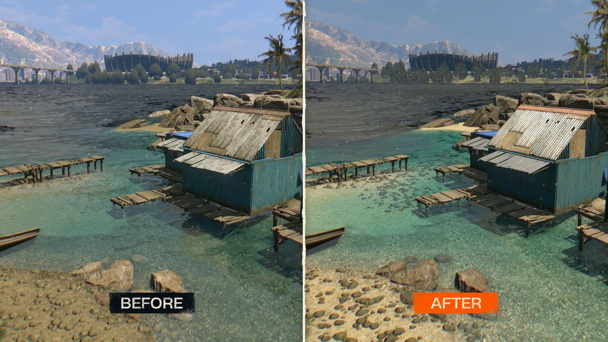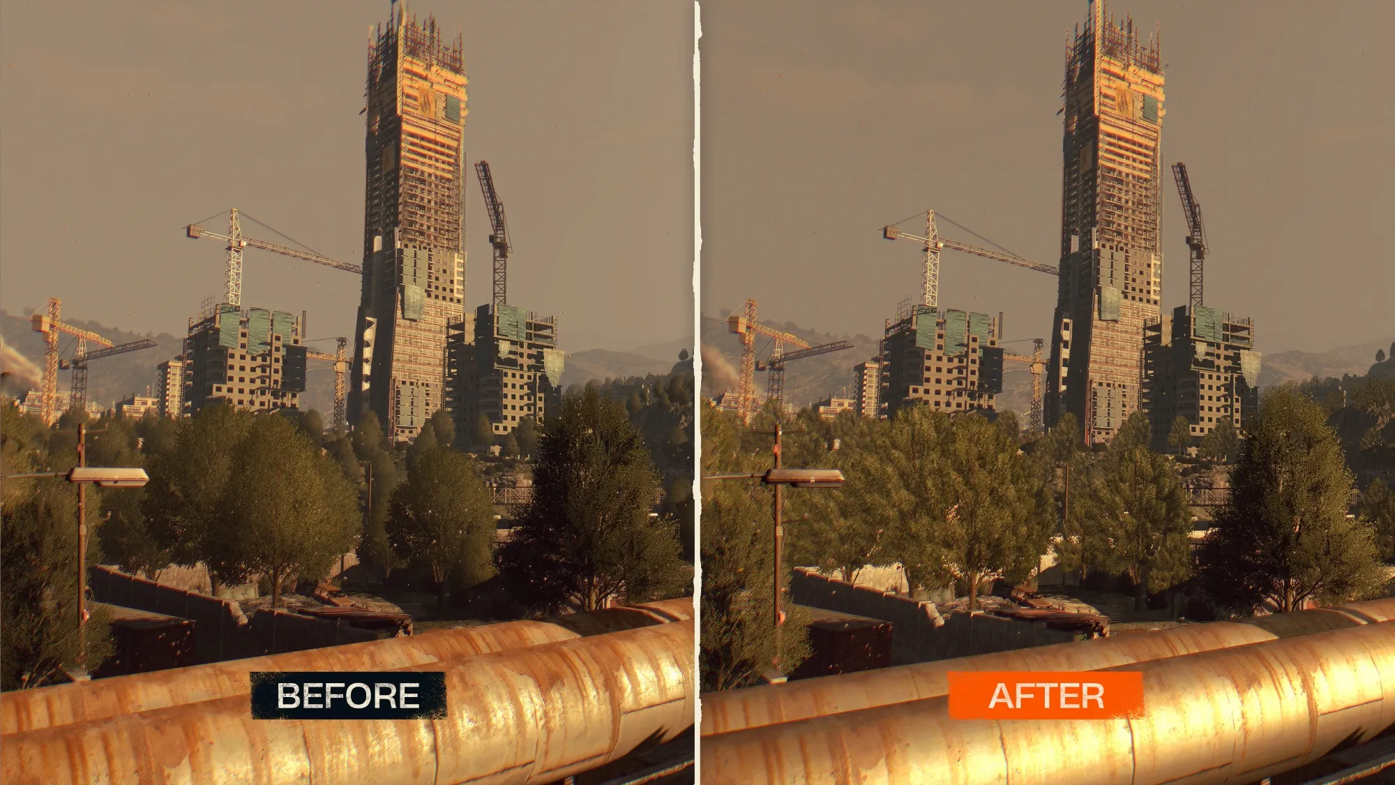 The Retouched update introduces upscaled textures, ultra 8K shadow quality level, and improved physics rendering on water and metallic surfaces. The game’s Level of Detail (LOD) has also been raised, meaning Techland increased the distance that detailed assets are loaded in the game. As Techland notes in its developer blog, Retouched is all about “squeezing out even more from the Dying Light you already love," although the level of improvements players will experience varies by platform. You can check out some before/after shots in the gallery below.