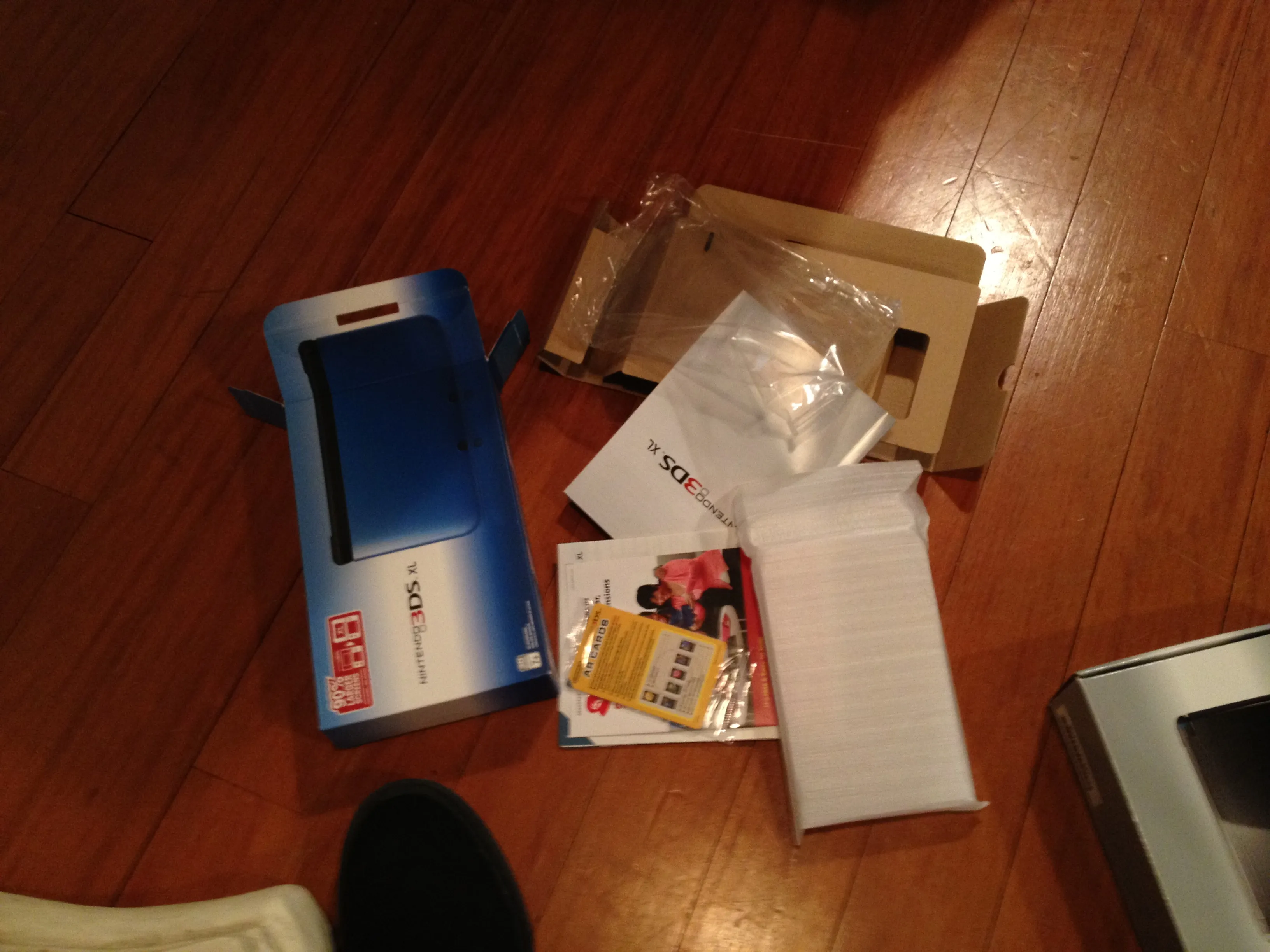 We've got a 3DS XL in the office, and we snapped a bunch of pictures of it next to other handhelds for all your comparison needs. First up, a comparison of the box. The system may be larger than the original model 3DS, but Nintendo has been able to use their collective Tetris skills to make everything more compact.