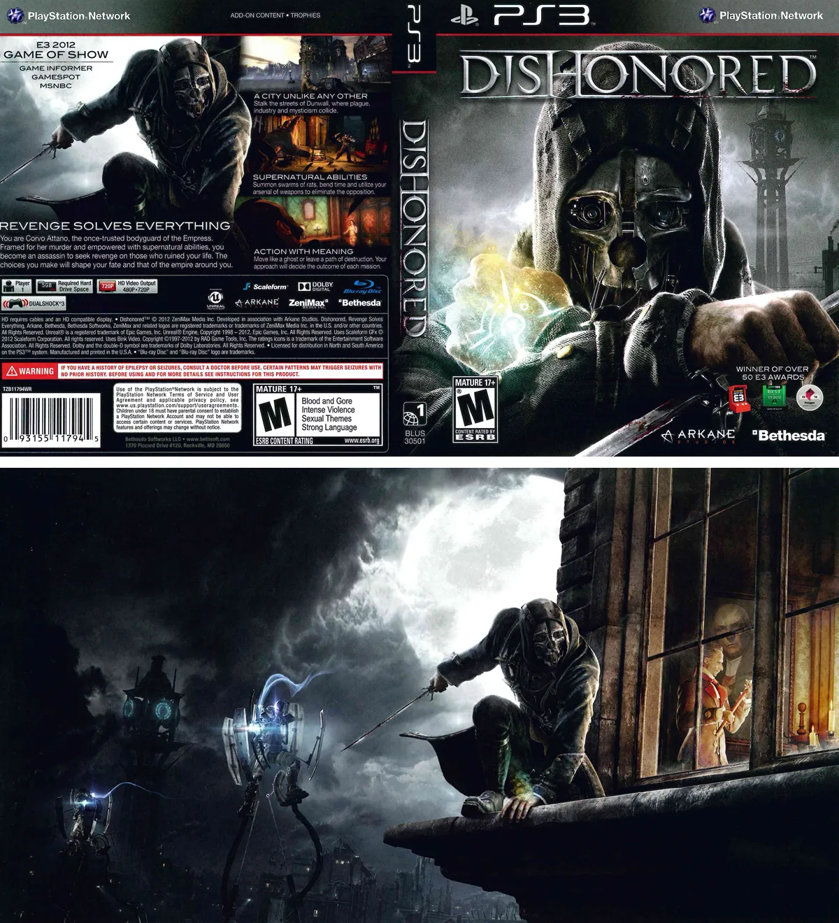 Dishonored's box, as most covers do, highlights the main character. This is the dude you will be playing as. Isn't he cool? The alternative art highlights the gameplay more, and features the awesome tall-boys..