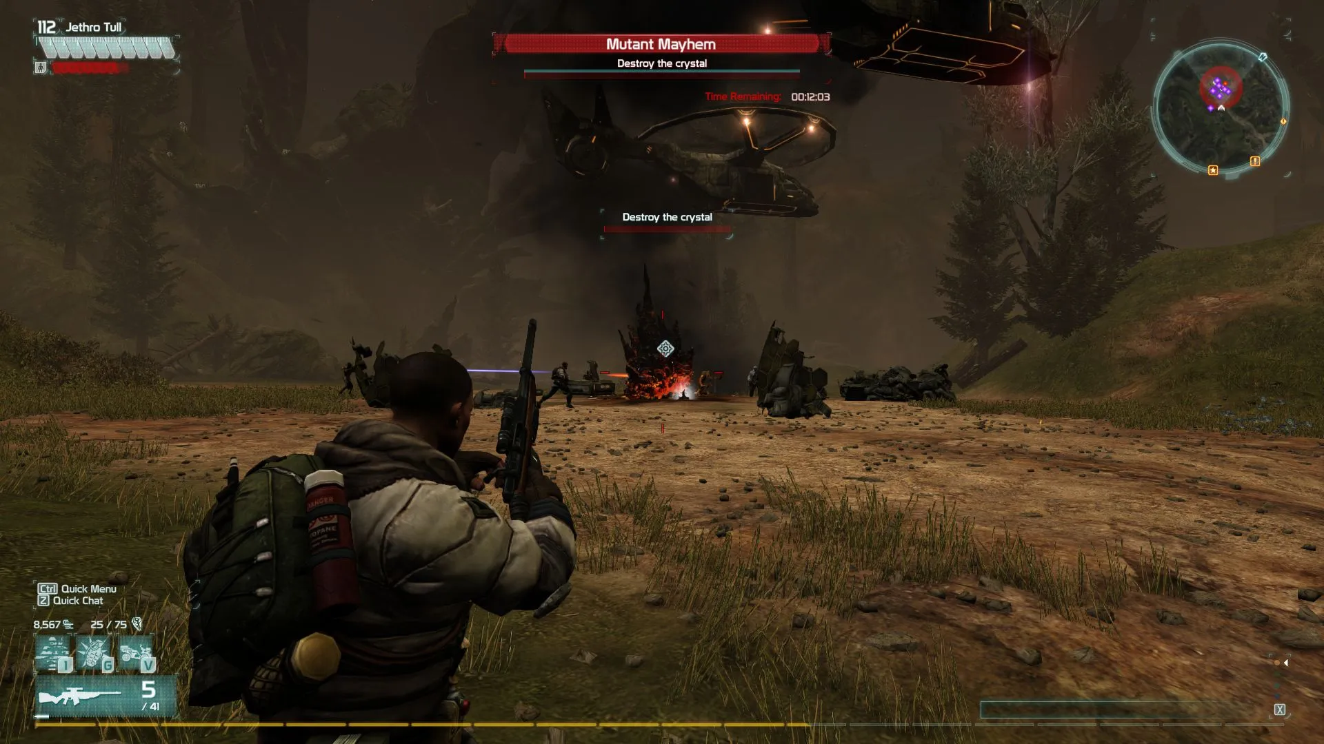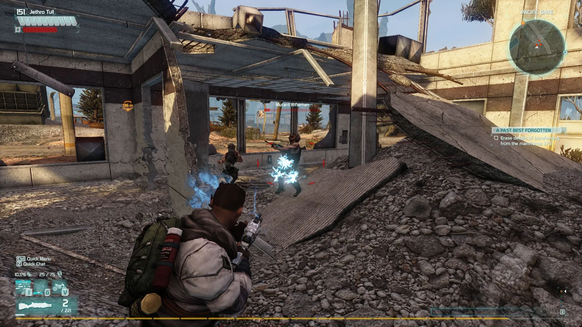 Unfortunately, Defiance runs into problems on the few occasions it does step outside its well-worn comfort zone. Arkfalls – pieces of alien starships that plummet from space and crash-land on Earth's surface, prompting intense battles over their valuable tech – are dynamically generated multi-stage boss fights that welcome all players' participation and scale their difficulty accordingly, and at their best are exactly the kinds of awesome large-scale cooperative battles I hope for out of a shooter MMO. For every cool arkfall, though, there's a scripting bug that prevents quest objectives from spawning properly or a poorly scaling encounter. One particularly dumb quest resolution had extra-fast melee enemies continually spawning with enormous health pools that could two-shot any player, who as a special bonus shrugged off point-blank shotgun blasts that I've relied on to knock back if not outright kill anything that gets too close to my sniper. I think I ate a dozen deaths on that one.