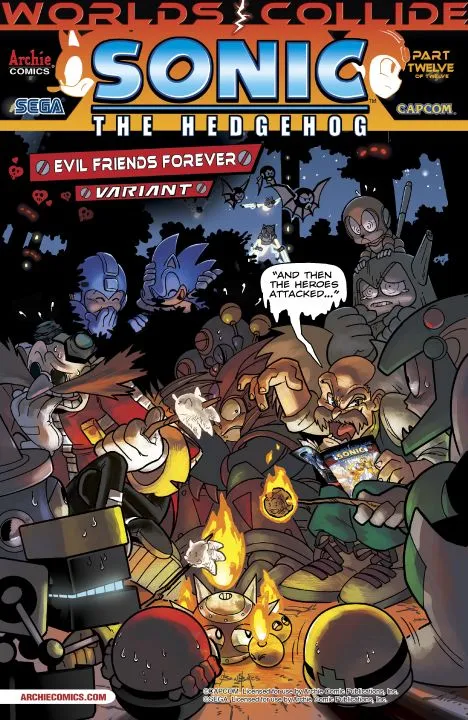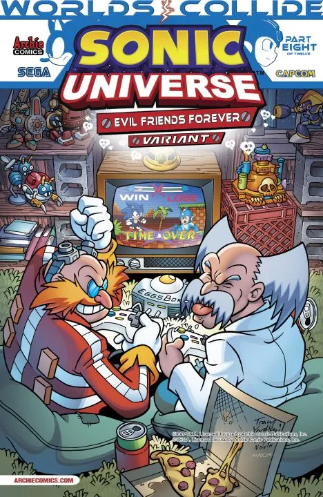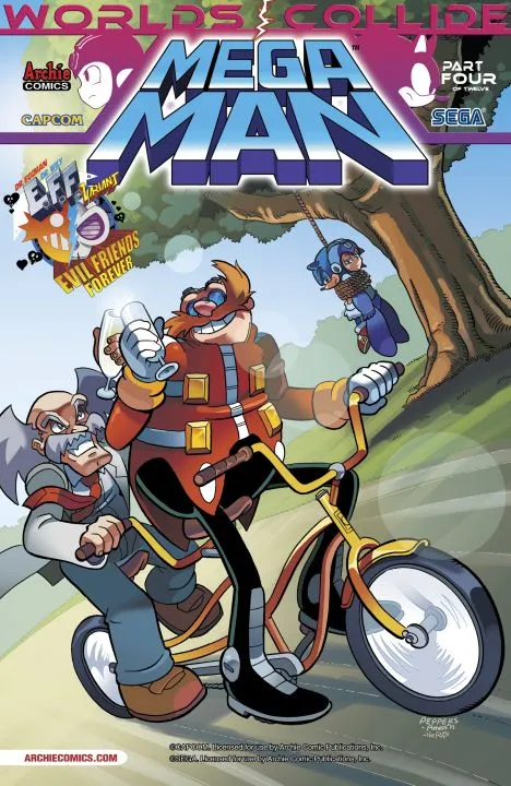 Archie is teasing a grand battle between Mega Man and Mecha Sonic on one cover, and say Wily and Robotnik will be riding a tandem bicycle sipping non-alcoholic mimosas on another.