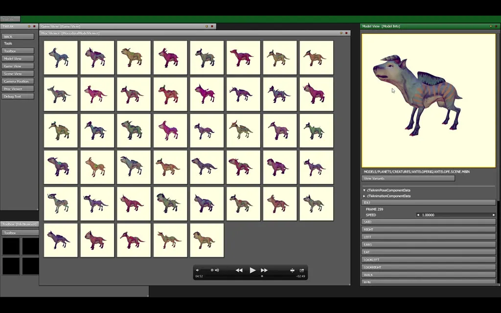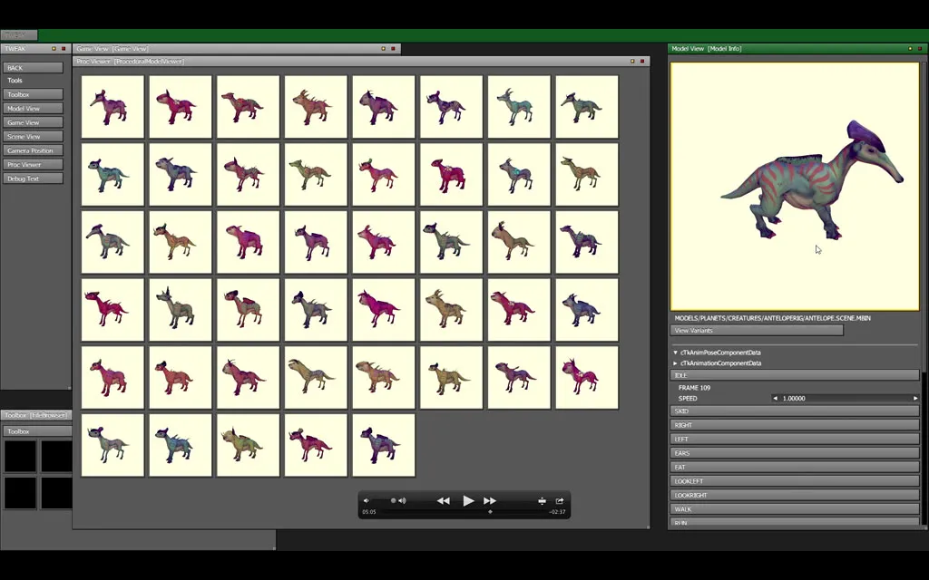 To illustrate, Beau Lamb, one of the game's artists, pulled up an animation of an aquatic creature. The animal in the larger window looked similar to a shark, but a multitude of smaller windows on the screen showed variations based on that template. With the click of a button, the windows refreshed with all-new animals, with different configurations of fins, colors, textures, and more. One had a head like a crocodile, and it looked like something you’d see in a book about prehistoric creatures. Another was colorful and featured a large number of flippers on its sides and belly.