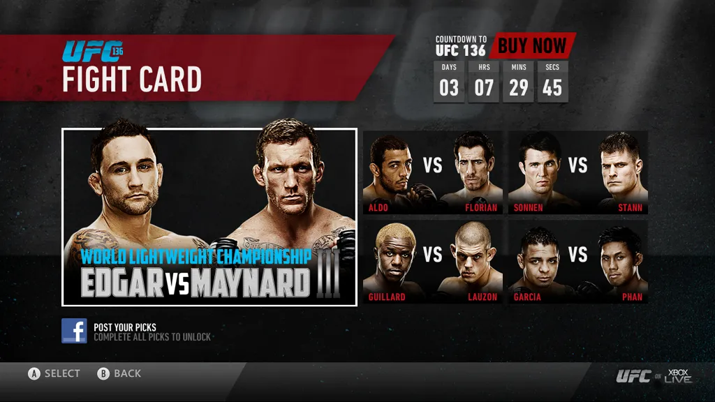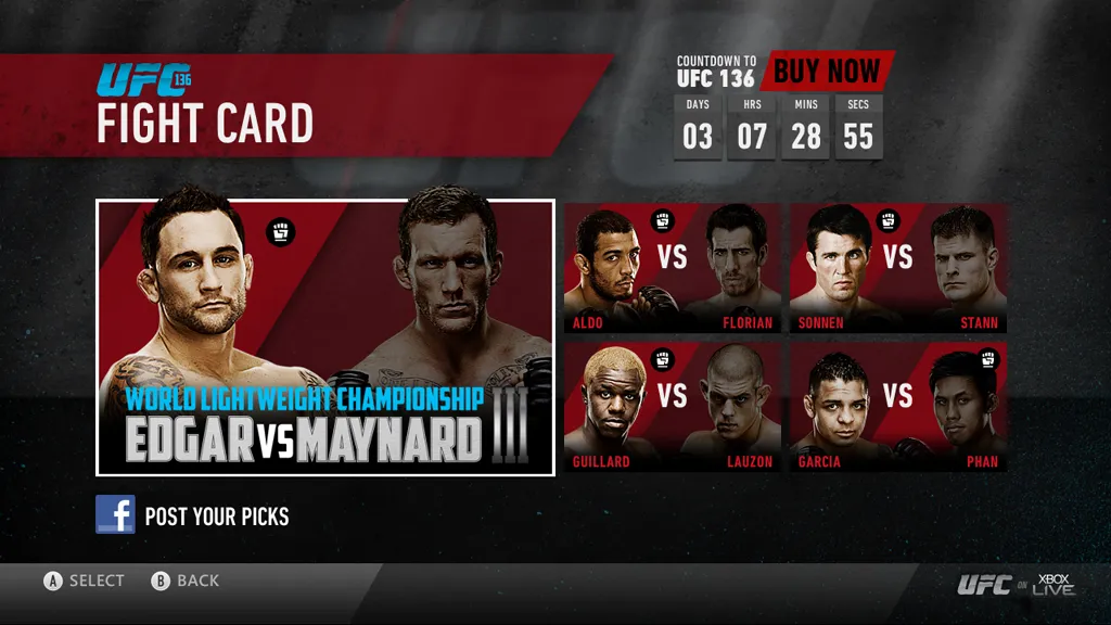 Microsoft has been positioning the Xbox 360 as a media hub for quite some time now, and today's batch of screens certainly reinforces that intention. As the company announced at E3, UFC matches will soon be available for live viewing on the console. These new screens show off some of the functionality that Microsoft hopes will entice viewers to reach for their controller instead of their cable box the next time a big pay-per-view match comes along.