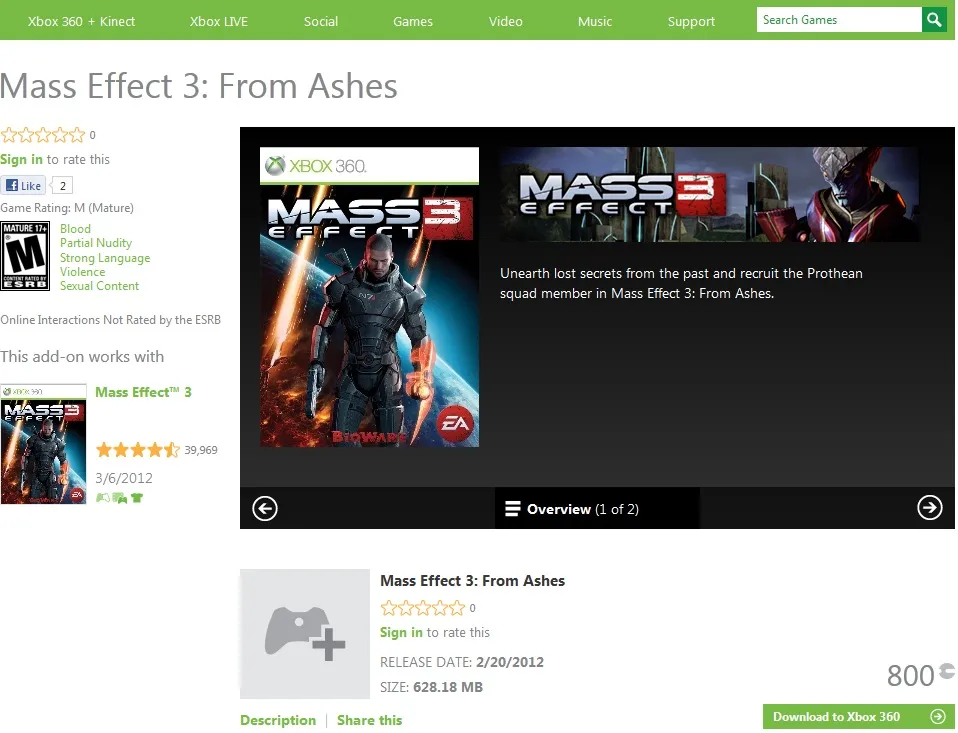 Dubbed "From Ashes," the content costs 800 Microsoft points. The content could not actually be downloaded, and has since been removed from Xbox.com. The add-on weighed in at a hefty 628MB.