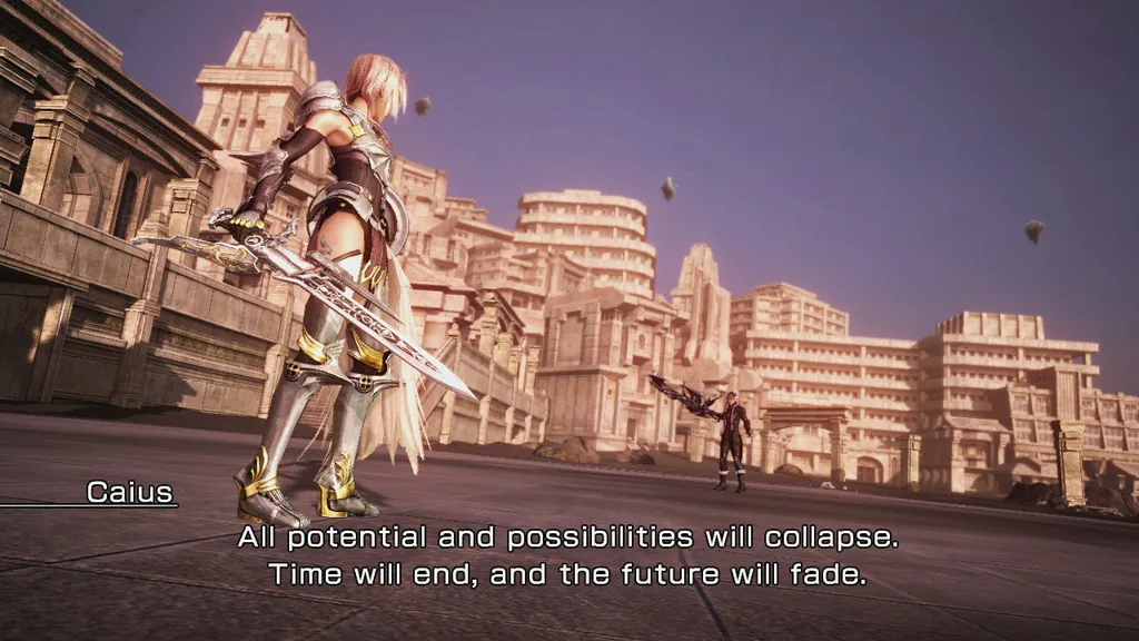 This DLC reveals the arduous battle between Lightning and Caius not shown in the main game. Players will be able to adjust the difficulty level and play as Lightning, who uses special abilities available only in this episode. Players will also be able to unlock the Final Fantasy XIII-2 version of Lightning as a party member. Because the episode includes important information relating to the overall storyline of Final Fantasy XIII-2, players are encouraged to complete the game prior to playing through this new content.