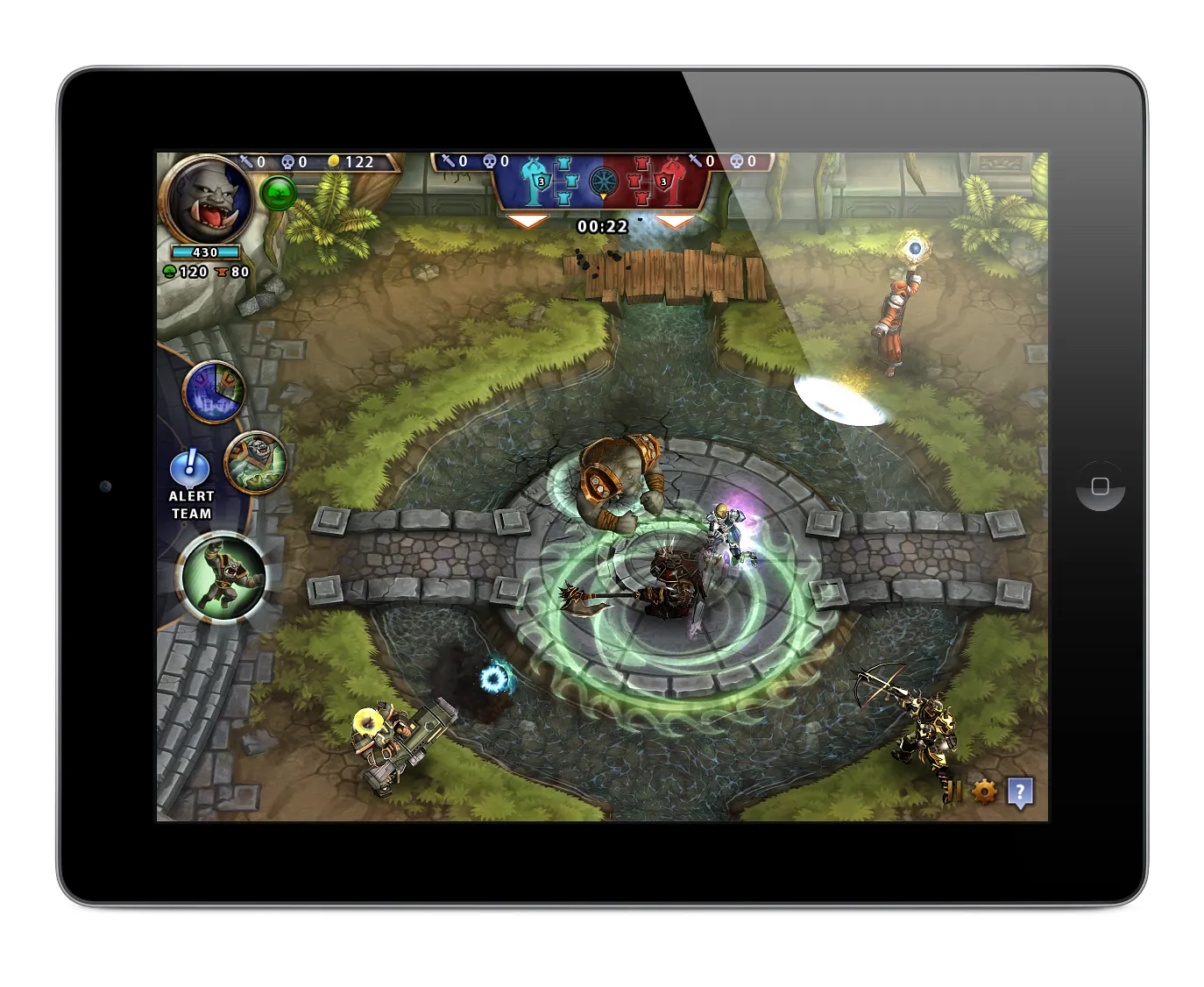 The touch screen controls are intuitive, and the map is condensed for quick play. There are no AI minions marching across the screen and no farming. Instead, if all three members of a team are knocked out, the four forward towers and large base are robbed of offensive power. They can be obliterated quickly in that scenario, which keeps games brisk (around 10 minutes each).