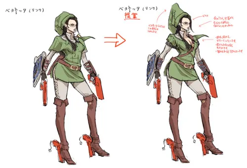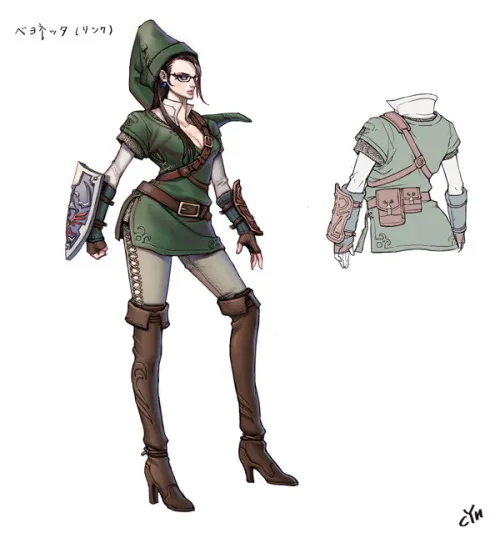 Cho also writes about suggesting Bayonetta's transformation into a Morph Ball when dressed as Samus, and how he drew Link Bayonetta in a conservative (conservative for Bayonetta, anyway) outfit, and it was Nintendo who actually pushed it to be more risque.