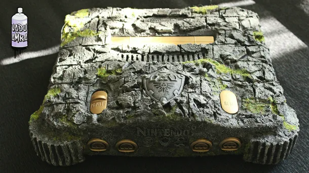 For this custom, Vadu decided to include the Spiritual Stones underneath the main logo on the front of the console, which she also reworked with a new font. In addition, the Hylian Shield was added to the top of the console, the switches, buttons, and ports were painted gold, and the entire console was given a layer of stone to make it look more ancient. She also put the Hylian Crest on the controllers. You can see more shots of the Ocarina of Time N64 below.