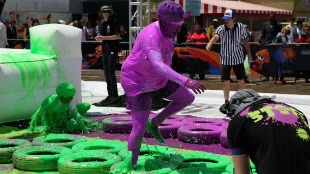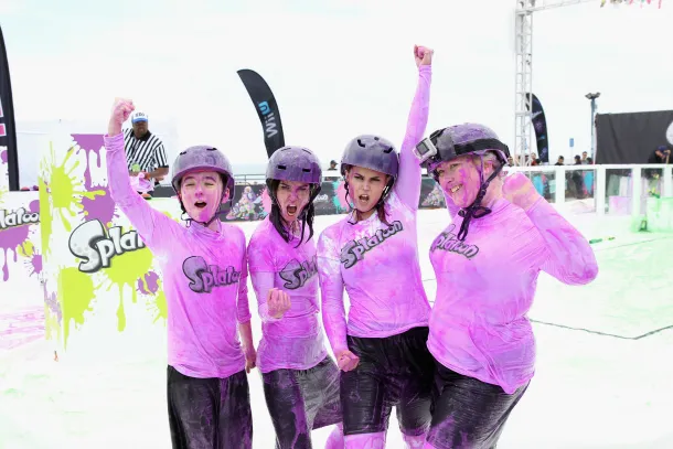 With Splatoon arriving in a couple of weeks, Nintendo took over Santa Monica Pier with a real-life obstacle course inspired by the game. Donning helmets and special Splatoon t-shirts, celebrities and kids were able to attack the obstacle course and emerge covered in ink.