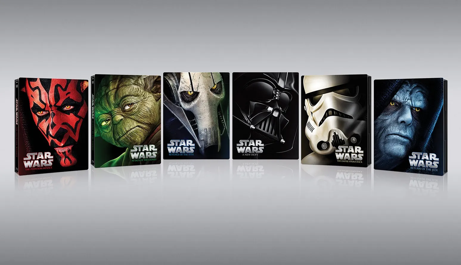 The Blu-Rays in the steelbooks feature all six of the first Star Wars films with previously released audio commentary from George Lucas and the film crew plus audio commentary from previously released interviews with members of the cast and crew. The steelbooks feature striking images of Darth Maul, Yoda, General Grievous, Darth Vader, a Stormtrooper, and Emperor Palpatine. If you'd like to see the images in bigger sizes, you can check out the gallery below.