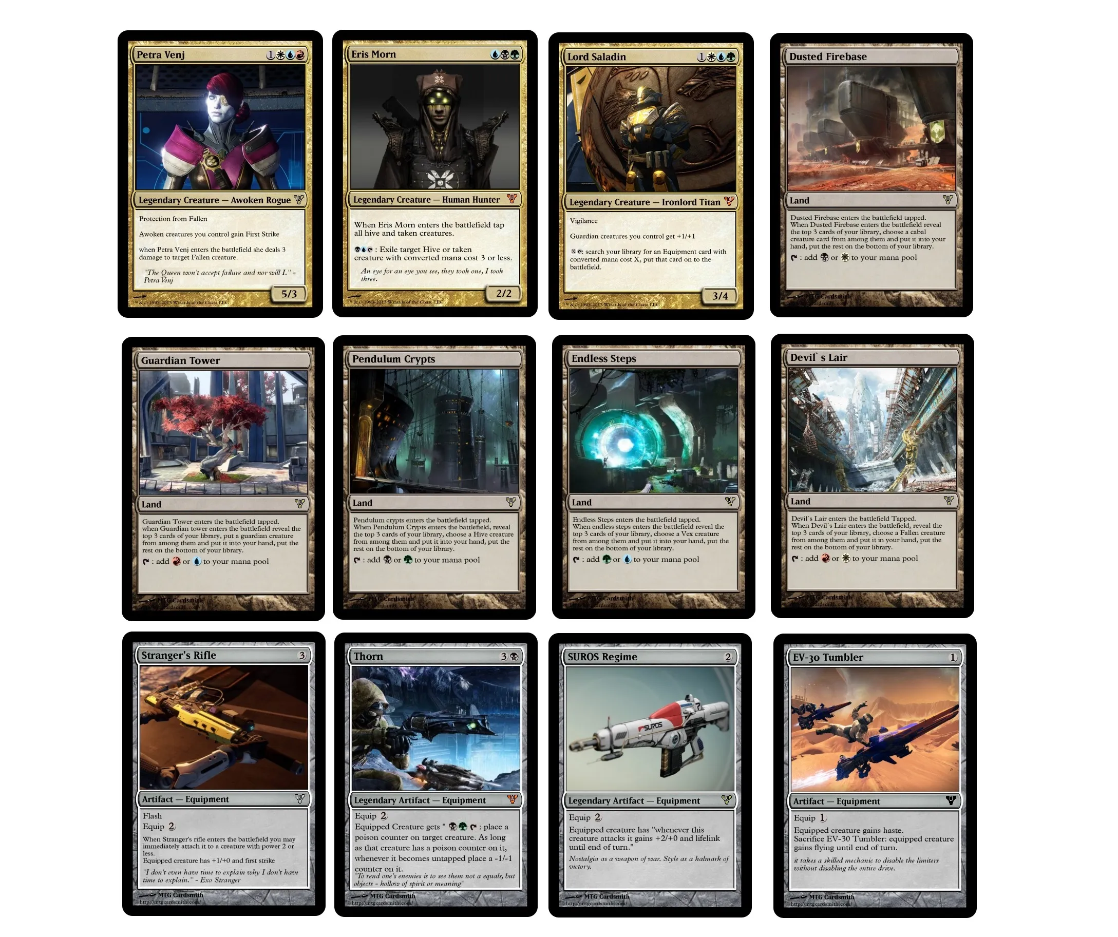 The good guys of Destiny get their share of the cards, too, with Cayde-6, Eris Morn, and Lord Saladin all acting as legendary creatures. Various vehicles and exotic equipment like the Thorn handcannon and Suros Regime auto rifle can be added into the mix for a modest mana count.