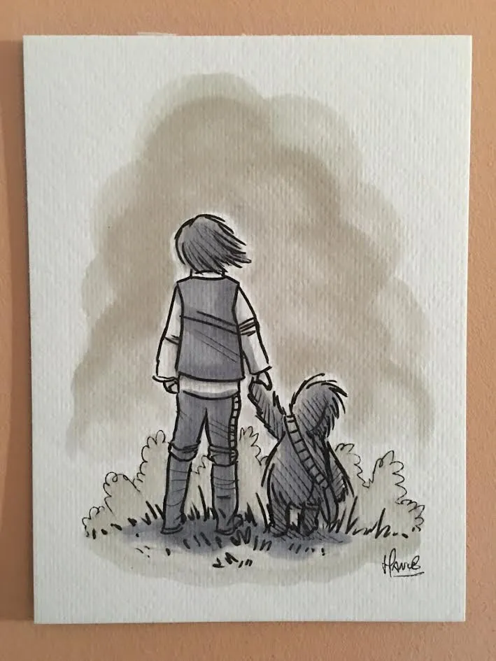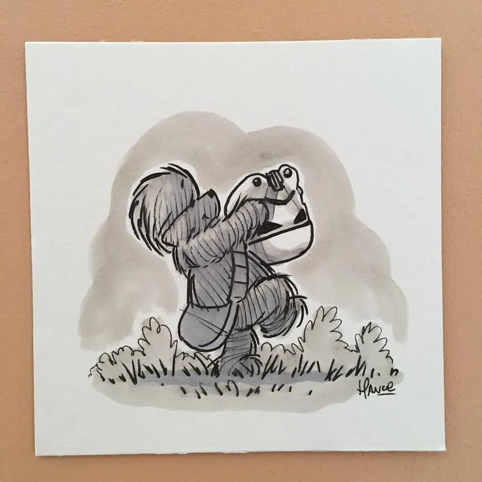 We're not sure what possessed artist James Hance to re-imagine Star Wars in the charming art style of Winnie The Pooh, but the results are too cute to question. Hance has created over a dozen sketches of a Pooh-ified Chewbacca, joined by a young Han Solo as Christoper Robin, a scarf-clad R2-D2 as Piglet, and a sad AT-AT filling in for Eeyore. Hance's initial Etsy sketches are sold out, though he has been adding new hand-drawn copies of the sketches daily. You can also order color prints and an illustrated book of "Wookiee The Chew" from his official website.