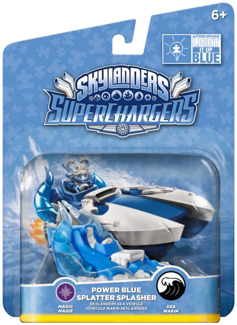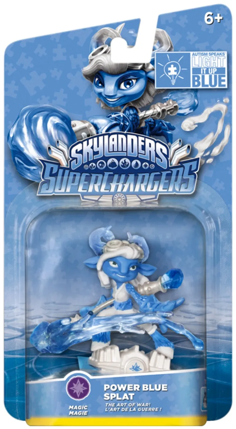 The blue and white Skylanders are colored to match Autism Speaks' “Light It Up Blue” campaign, which seeks to highlight autism as a global health priority. Characters Splat and Trigger, as well as their SuperCharged vehicles, will appear in-game bearing the organization’s unique palette swap.