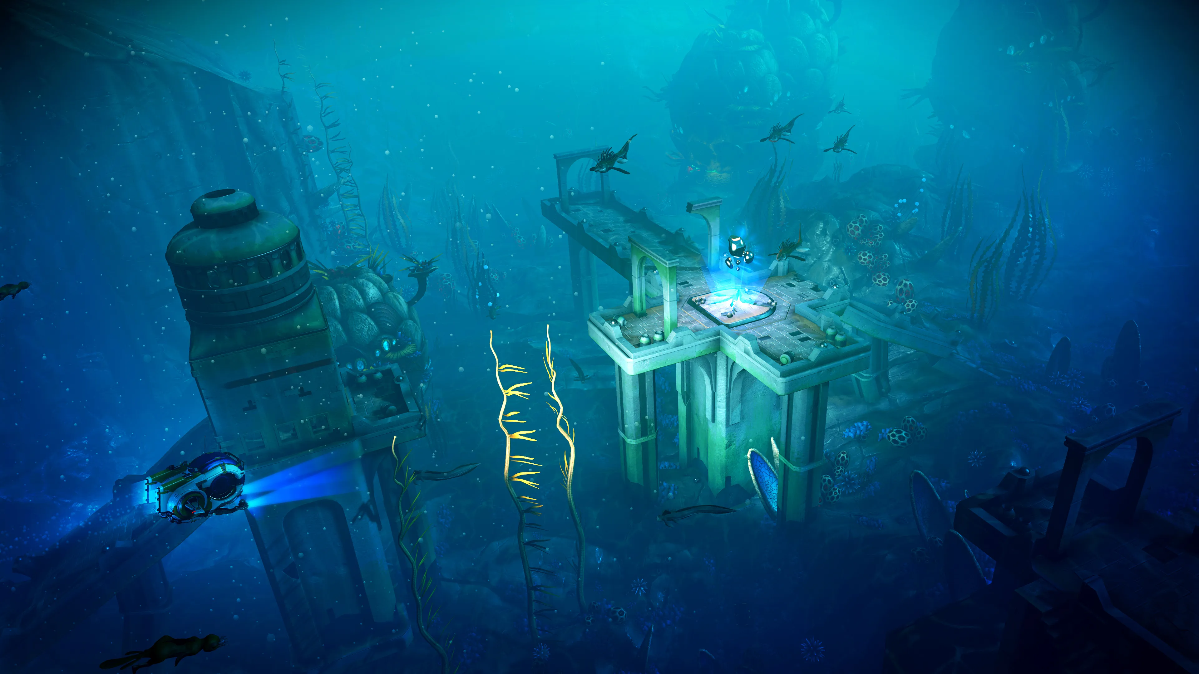 The Abyss brings visual improvements so that oceans can be explored in "even greater detail," 20+ new construction modules are included to build more expansive underwater habitats, more diverse biomes and fauna, more sea creatures, submarines to maneuver, lucrative sunken ruins, and more.
