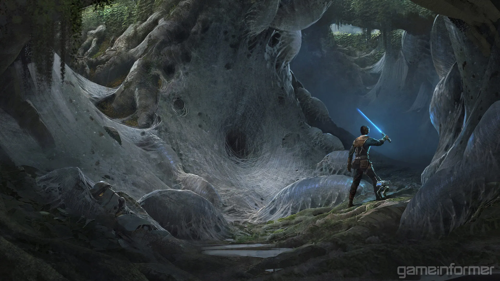 Kashyyyk’s wilderness offers much more than the gargantuan Wroshyr trees the wookiees build their homes in. Dangerous things roam this planet, and some are found lurking in caves darkened to the point that Cal needs to use his saber as a torch. One such threat is a human-sized spider with yellow and brown markings on its bulbous abdomen. The spiders are aggressive and use webbing to try to slow prey down. Their legs are no match for a lightsaber, however. If Cal can get a drop on it, he can perform a stylish one-hit kill by leaping up on its abdomen and sending his saber through it. We also learned about a large frog-like creature from another planet with a lengthy, sticky tongue that can be chopped in two. Respawn wants to add as many of these one-hit kills as it can, but time and budget will dictate how many make it into the final cut of the game.
