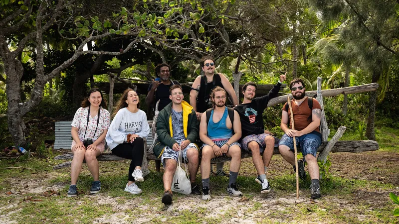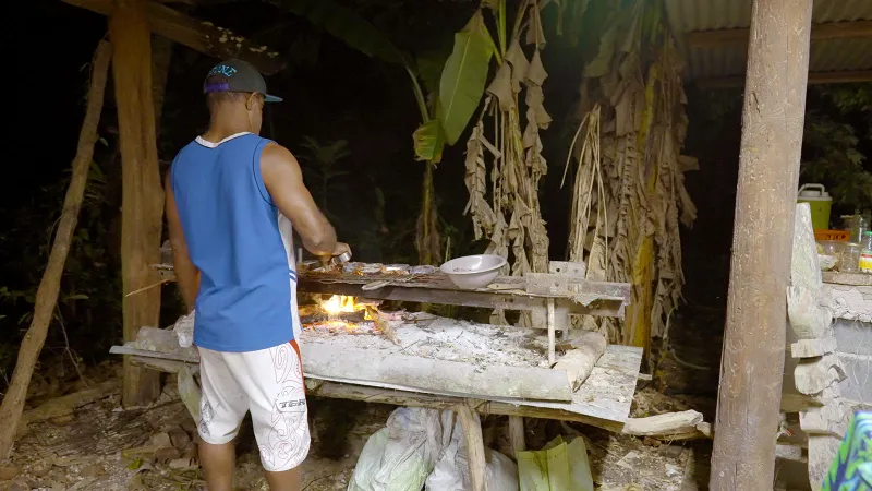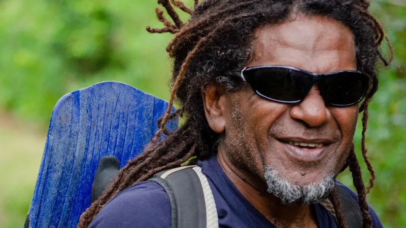 The most unusual and interesting person I meet on my trip is a man named Thoane. He’s immediately welcoming and friendly, with deep smile lines around his eyes and a jovial nature that invites conversation. A native Kanak who lives here on Lifou, he’s pulling multiple duties in his involvement with the Awaceb development team. Thoane is a chief cultural consultant, helping to ensure the team members accurately present aspects of Kanak life and language. He also plays a significant voice-acting role in the game, speaking and singing as Tre, a family friend to Tchia and her father. And for this trip, he’s our guide on Lifou, taking us on expeditions into the wilderness and even welcoming us to his home for traditional meals.