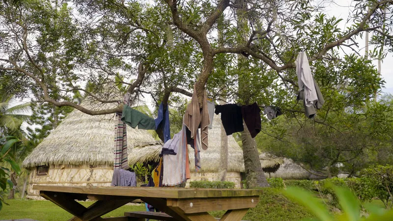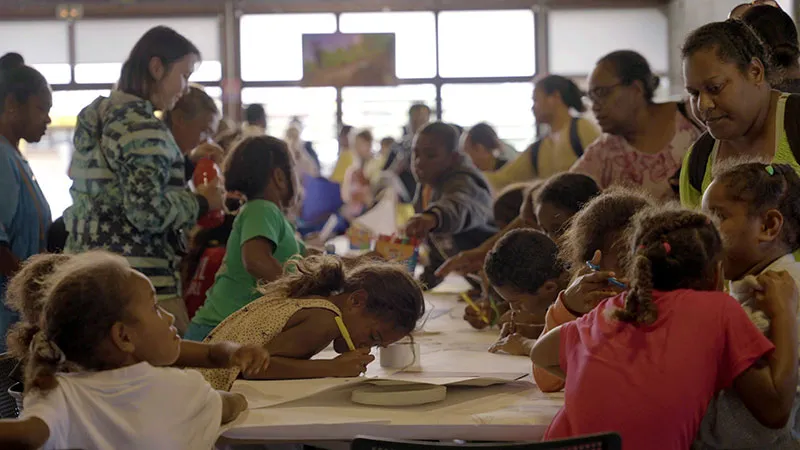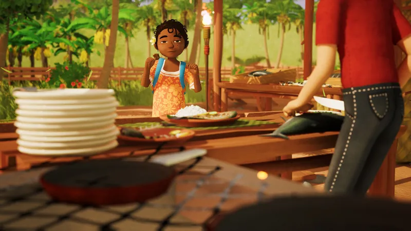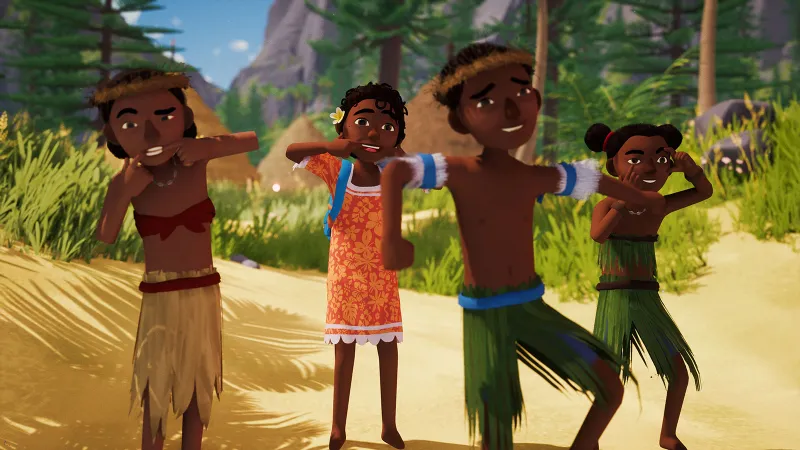 I’m standing outside one of Lifou’s cultural hubs, a meeting hall for significant events for the Kanak people. Today, the interior has been given over to posters and artwork depicting Tchia and her exploits. A monitor has been raised that plays an extended trailer of the game. Tables are set up for the local kids to complete art projects.
