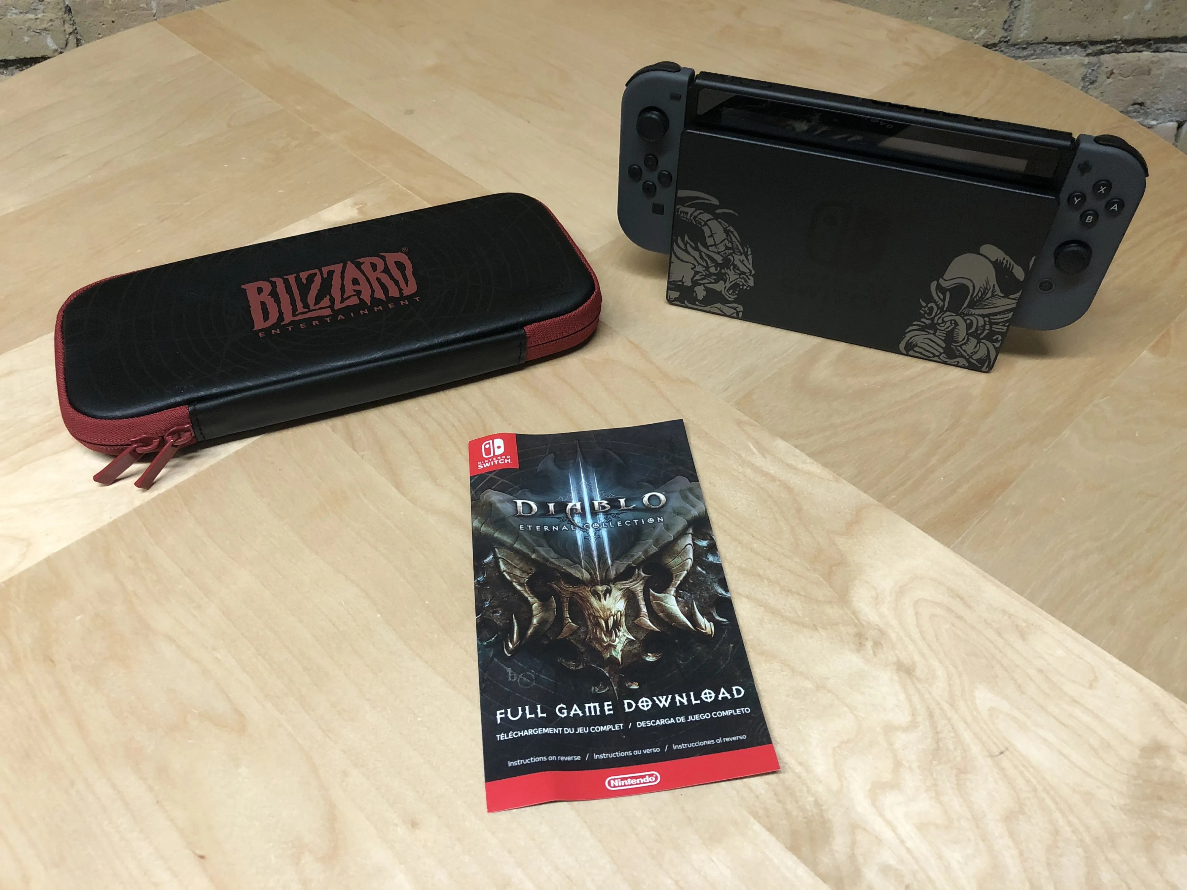 We were sent the Nintendo Switch Diablo III Bundle, so we decided to snap some photos and show off how it looks. The carrying case is nice, and the art on the dock is good looking. However, having the art on the Switch unit itself relegated to the back is a weird choice. It's also disappointing to have the bundle come with the standard charcoal Joy-Cons and not have any special design on the Joy-Con Grip.