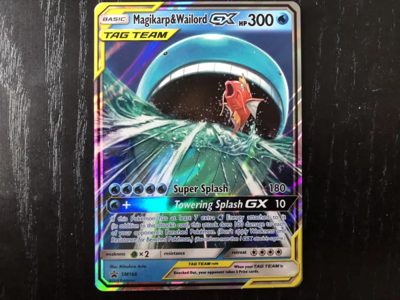 The new expansion introduces more than 180 new cards, including 6 Tag Team pairings. The Pokémon Company sent us a ton of booster packs, both themed decks (Relentless Flame starring Charizard and Torrential Cannon starring Blastoise), and the Towering Splash GX box featuring a special Magikarp & Wailord GX Tag Team card.
