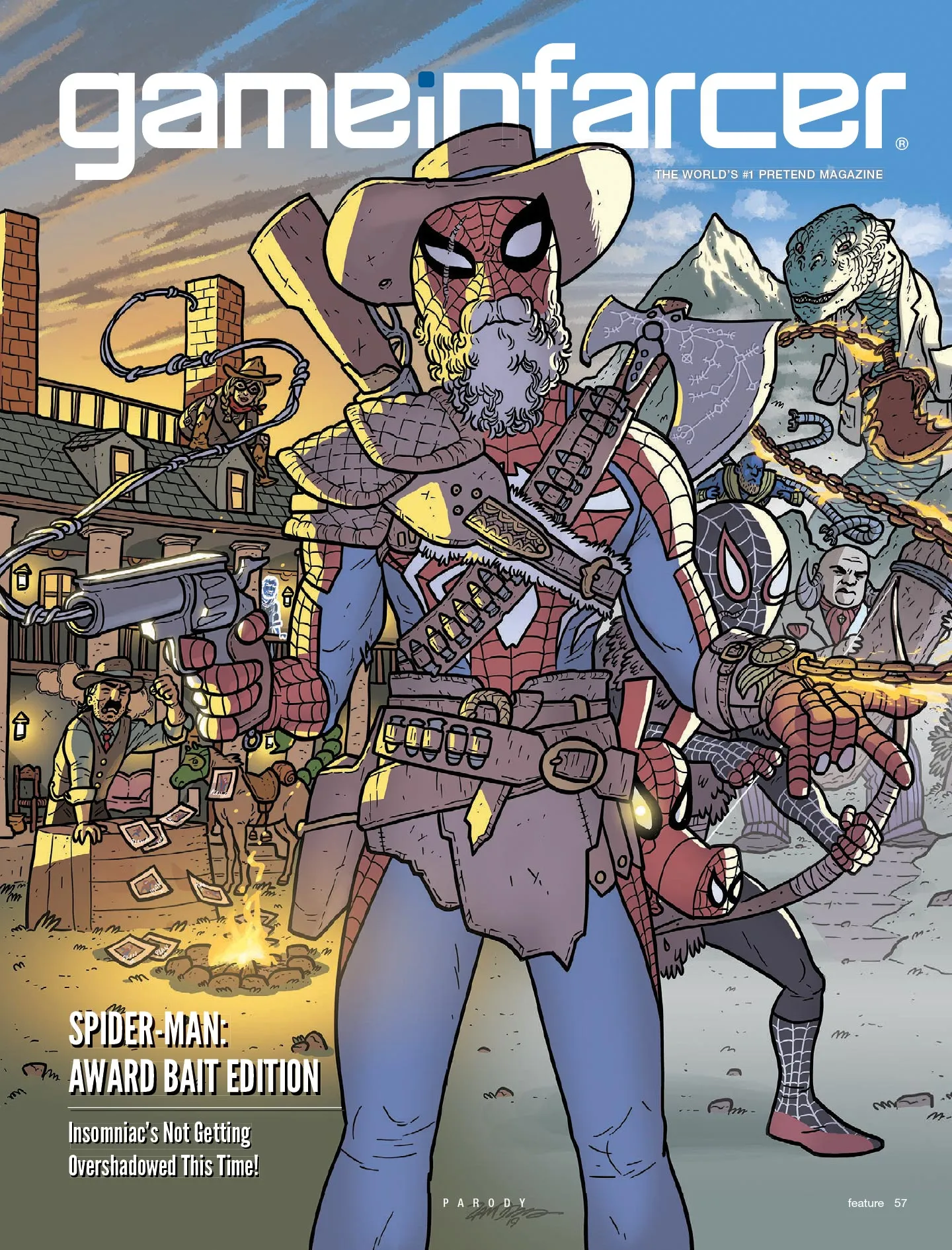 BEN: I was really excited about the idea of Peter Parker having an Old West gun that shot webs. But, I also remember us trying to find the right words – at one point, we talked about it just being an article inside Game Infarcer, instead of the cover, just because the joke needed so much explanation.