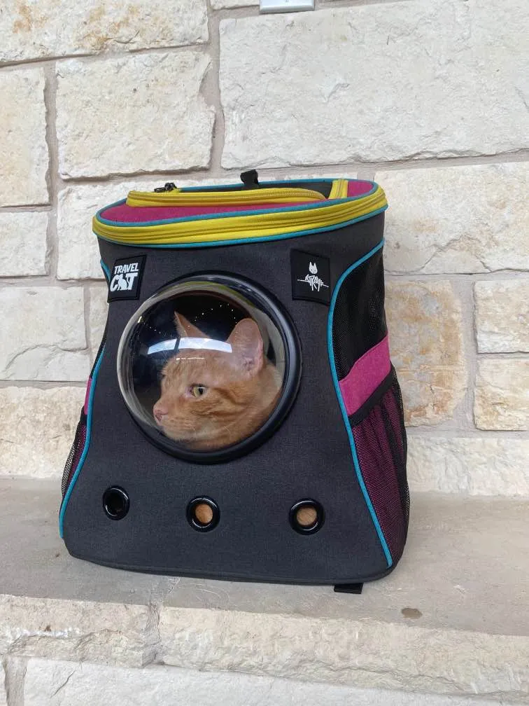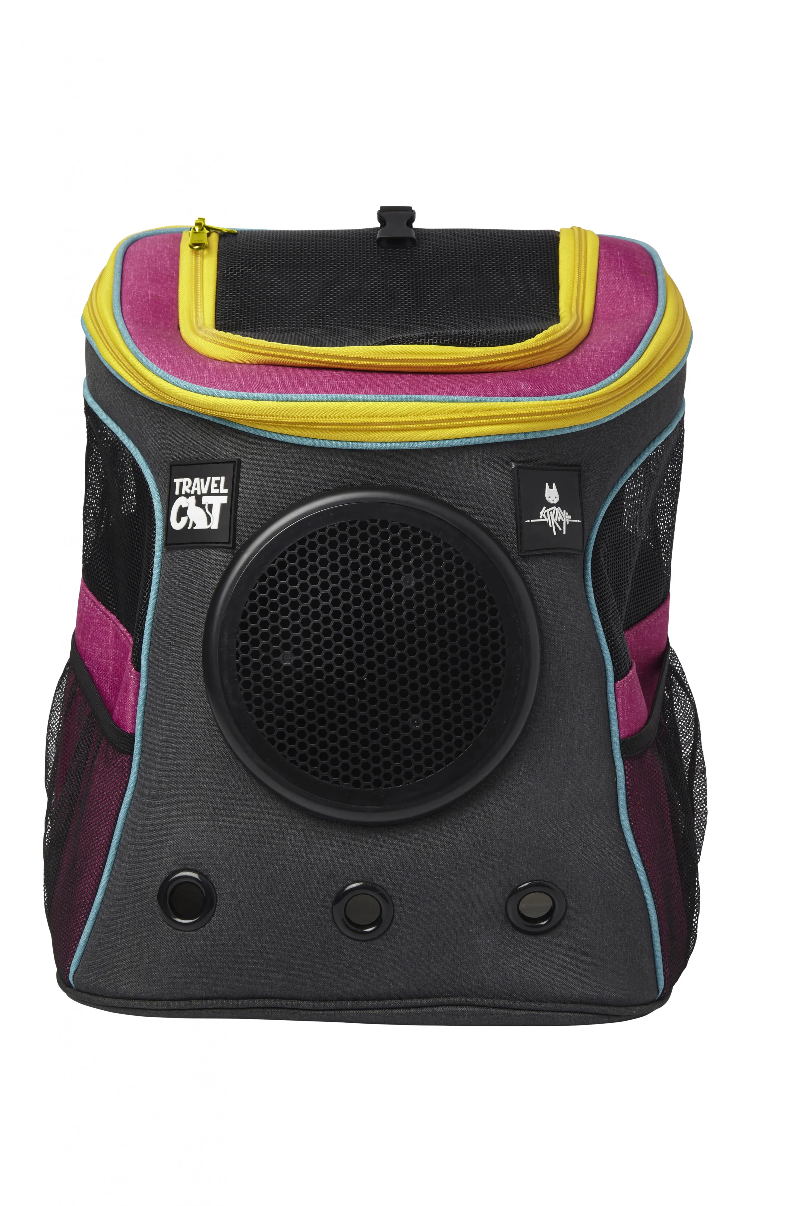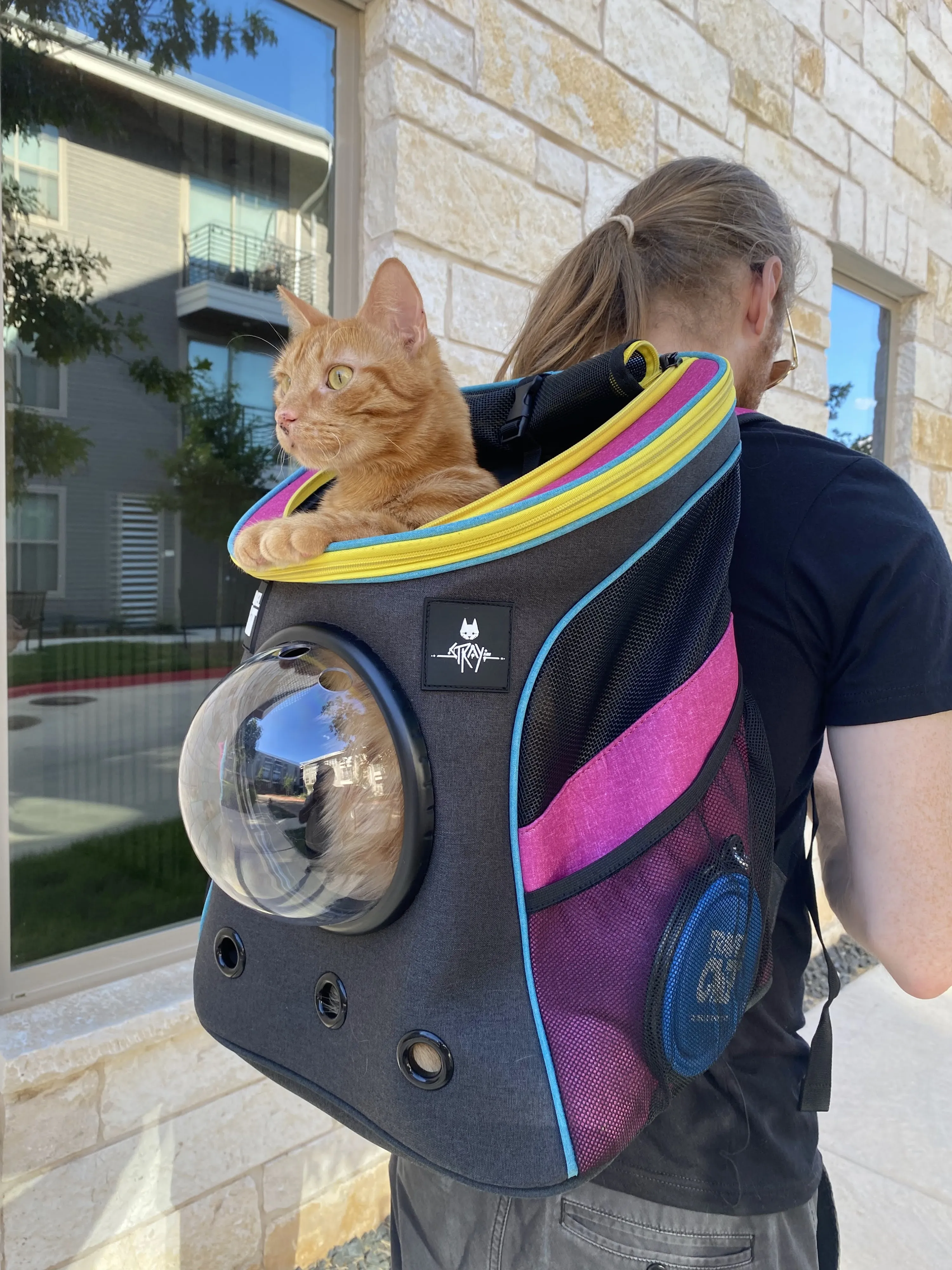 If you’d rather give your cat the royal transportation treatment, the Stray version of Travel Cat’s popular “The Fat Cat” backpack is up your alley. This colorful pack can support up to 25 lbs of feline and is made of breathable, well-ventilated material and a little bubble for the cat to curiously peer at the world. Pre-orders are open now and will set you back $139.99.