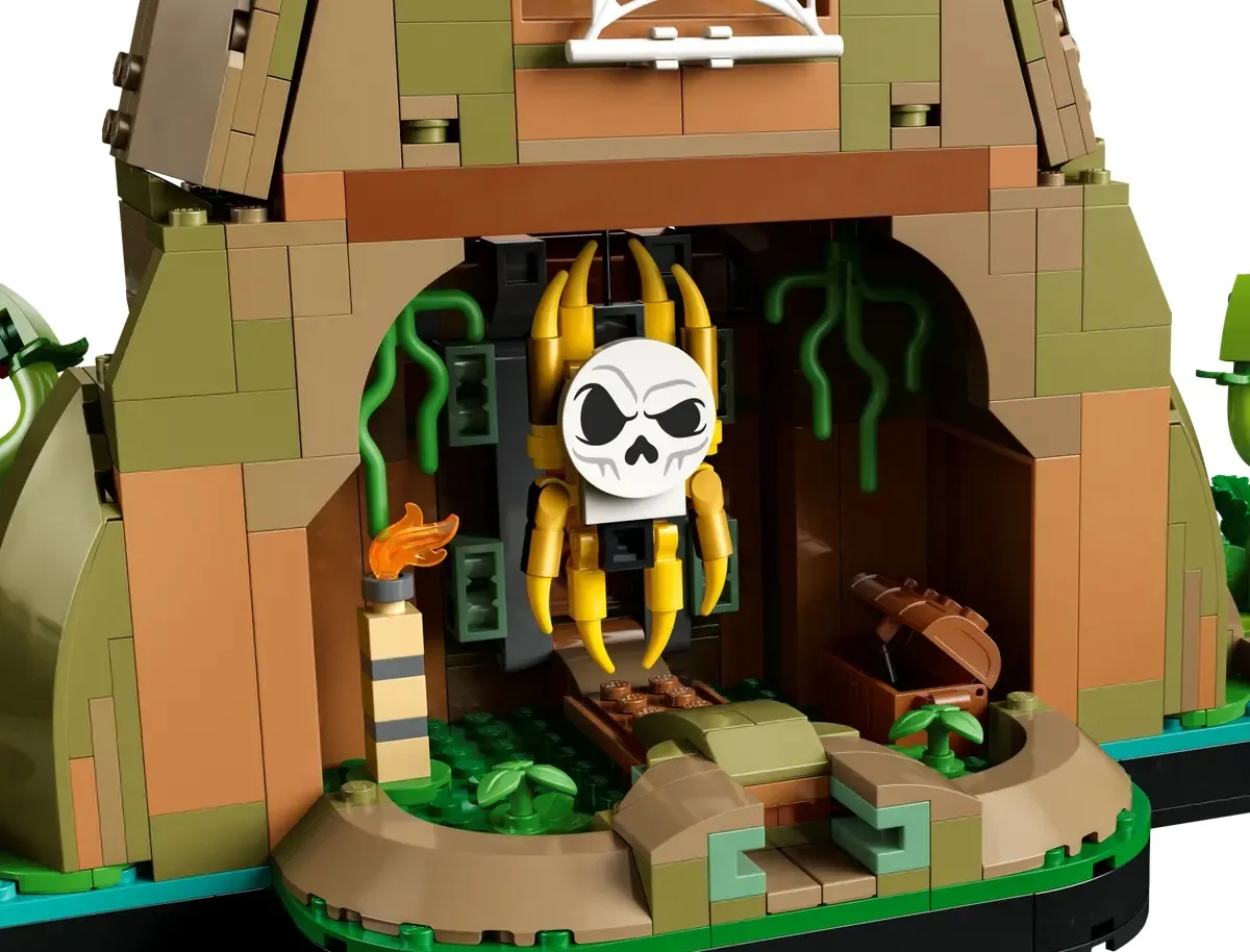 The 2,500-piece set lets owners build two scenes modeled after the Great Deku Tree from Ocarina of Time and Breath of the Wild. In terms of characters, it includes both games' versions of Link, BOTW Zelda, and the maraca-shaking Hestu. Smaller details include the cooking pot, a Skulltula, treasure chests, and a Korok tucked away on the treetop.