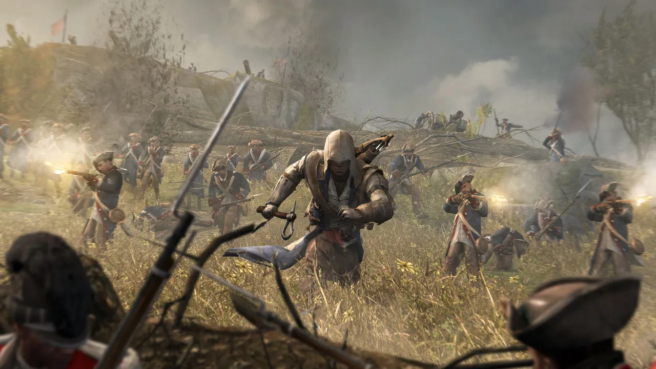 Connor dual wields a tomahawk and dagger against the attackers. The redcoats’ muskets are clumsy at close range, and the soldiers are no match in melee combat against Connor. The assassin swings his blades, hacking an enemy in the back with the hatchet here, and stabbing one in the face with the dagger there. He pulls out his twin flintlock pistols, dispatching two guards simultaneously with a ringing report. The hero retreats when an overwhelming number of reinforcements rush him.