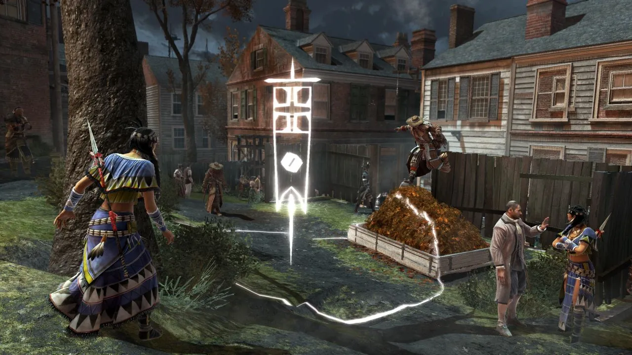 Along with providing a greater sense of place than its predecessors, Assassin’s Creed III is more deeply rooted in historical time as well. If new hero Connor isn’t involved in every memorable moment of the American Revolution, it’s only because he can only be in one place at a time. Flinging boxes of tea into the Boston Harbor and running between cannon blasts at Bunker Hill, the game feels more cinematic and scripted than it has before. Many times, this approach results in thrilling intensity, but some missions subtract from player agency by leading players along with a string of breadcrumb objectives. Other sequences recall the freeform assassination sequences of the first game in the series. An intriguing new approach to mission synchronization offers players more optional mission objectives, increasing replay value. Most of these objectives make the sequence play out in a cooler way, but a few seem contrary to the mission’s goals, like the need to perform a special type of assassination kill during a mission that is otherwise about stealth.