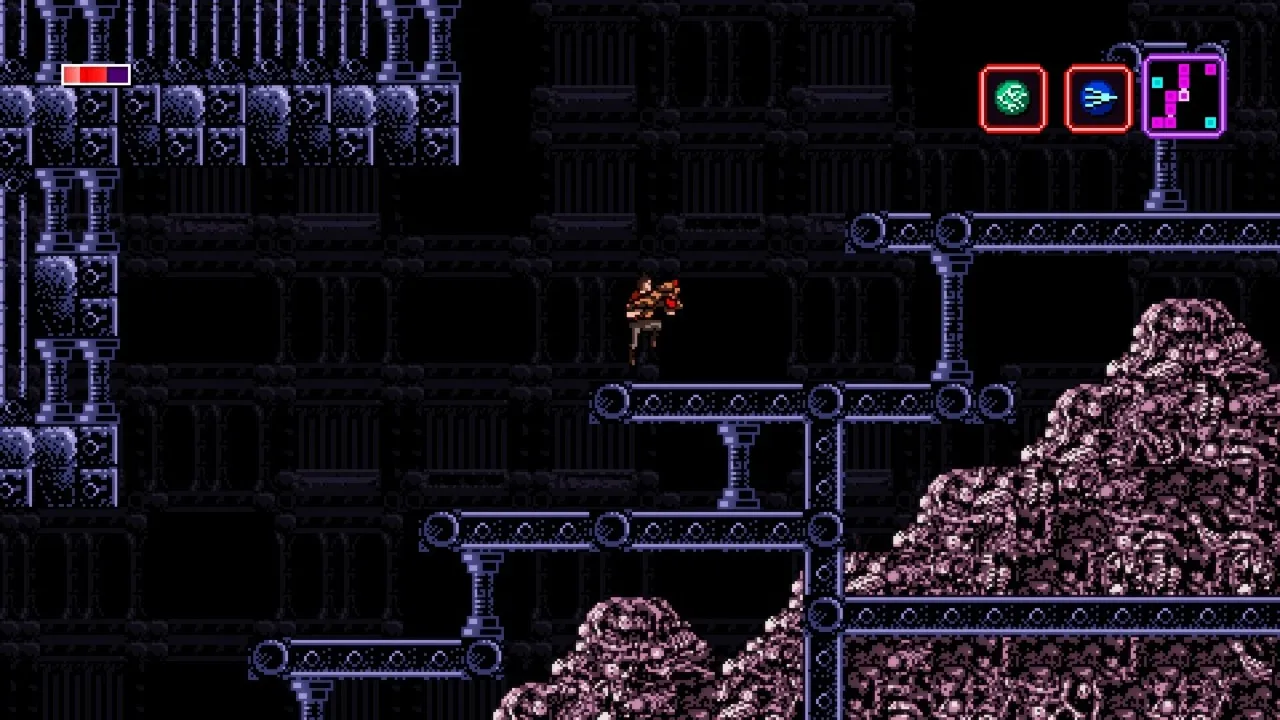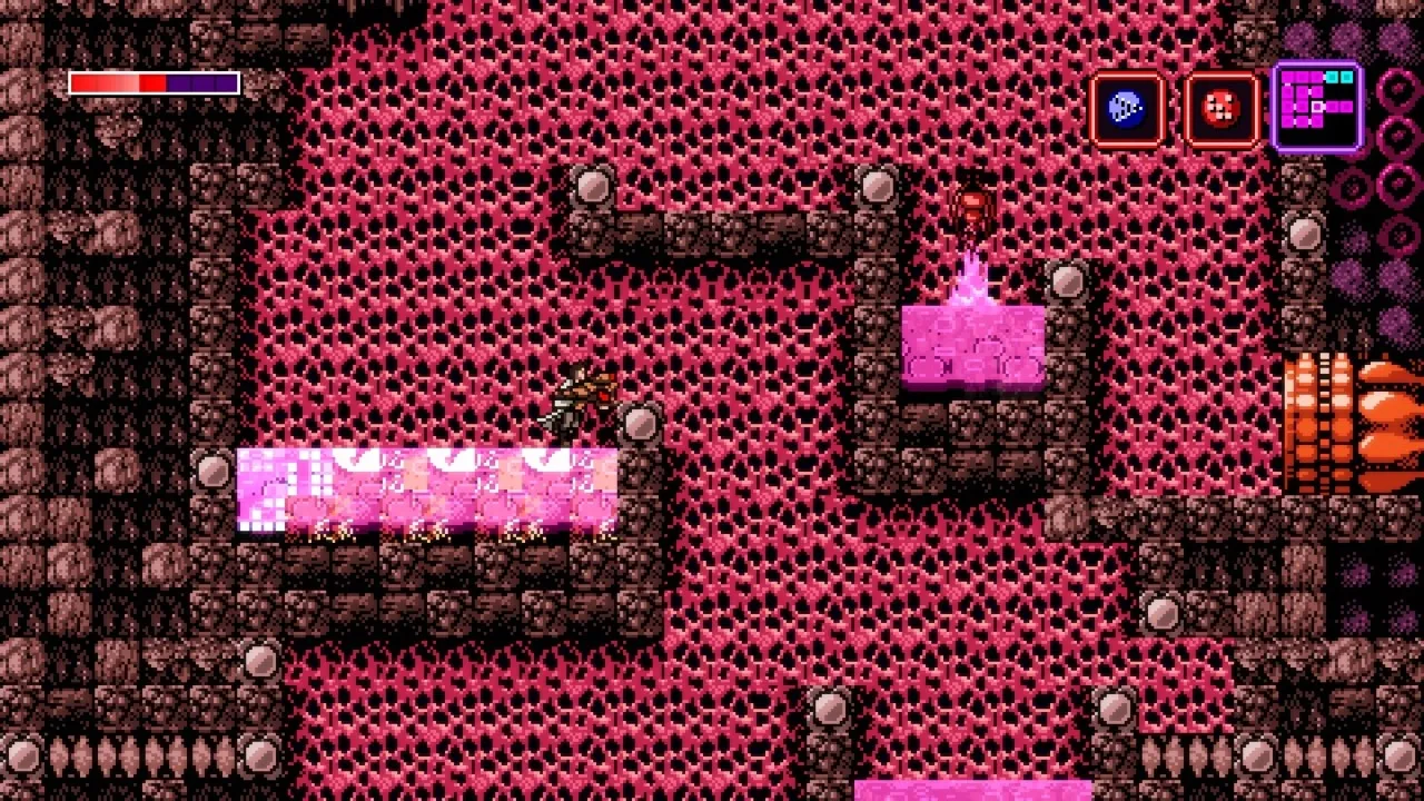 Straightforward hallways and vertical shafts are mixed in with puzzles and gates that prevent you from passing until you return with a new ability. Axiom Verge has no waypoints or dots to remind you of an out-of-reach power-up. I wish I would have taken more notes along the way; returning to nab power-ups or figure out where to go next can get confusing and frustrating. However, I don’t necessarily want to stop the flow of gameplay to sketch out secrets on graph paper every 10 minutes.