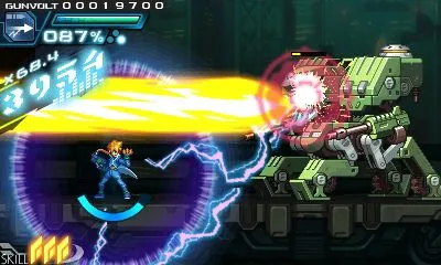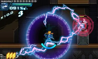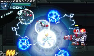 After a brief intro level, you select which of the six main stages you'd like to play. These courses, filled with missile-firing enemies and various hazards, are moderately challenging without being remarkable. The real treat lies in trying to kill as many enemies in a row to boost your multiplier. Activating a checkpoint unlocks a nifty spot to respawn (you have unlimited lives), but at the cost of your kill streak. Scoring big wins you a chance to be resurrected mid-battle and increases your post-level score, earning you materials used to craft items that raise defense or the effectiveness of recovery items. Gunvolt emphasizes performing well rather than enduring sadistic, old-school punishment. It's a fun gameplay hook, but I wasn't enticed to replay levels in order to achieve higher grades.
