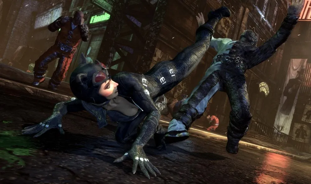 Moving right into combat, I immediately noticed that Catwoman moved much faster than Batman. While the overall feel was similar – knocking enemies out with a flurry of blows, watching carefully to counter-attack when possible, and mixing in tools on occasion – Catwoman leapt between opponents at lightning speed, quickly jumping back and forth between foes rather than concentrating her force on a single enemy. A dodge move allowed her to bound over the head of opponents. One awesome move (shown in the trailer below) had her kissing an enemy before flipping him onto his back.