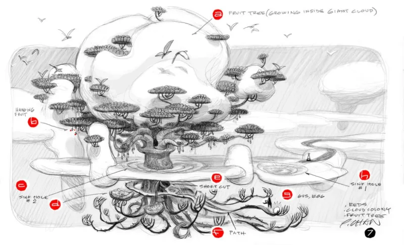 This feature comes in handy when trying to piece together one of Meriloft’s many puzzles. Writing about Double Fine’s clever puzzles is tricky without giving them all away, but I’ll give you the gist. I scoured the misty world for valuables to offer a deity, which earned me a meeting with an enlightened priest who has an idea for how to harm Mog Chothra. I put one of Isaac Newton’s laws to work via another too-generous offering on a rickety altar, granting me access to a forest below with trees that produce tasty sap. I also gained access to Jesse’s lost egg by intentionally plummeting through the clouds a few times and exploring the roots of a big fruit tree growing into Meriloft.