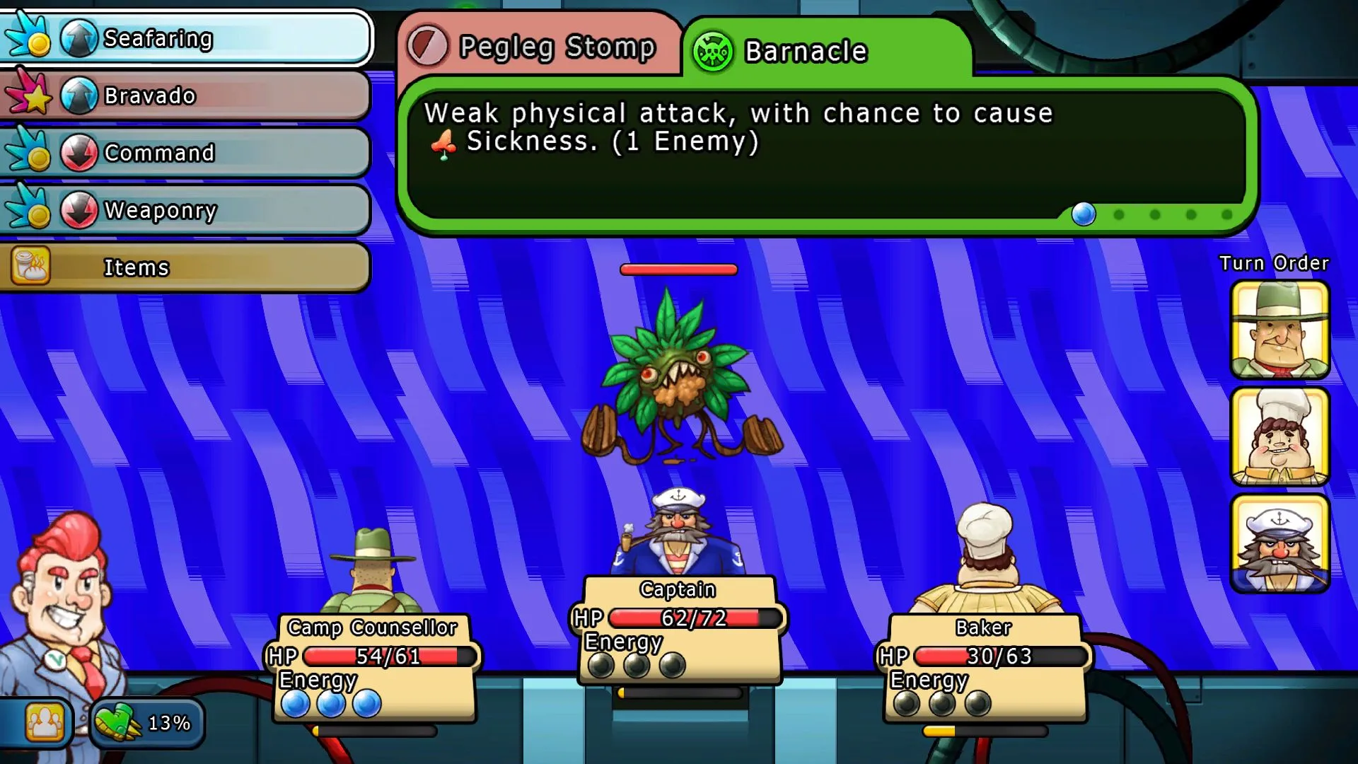 On the surface, the combat is your tried-and-true, turn-based RPG, but Citizens of Earth pulls in an interesting energy system. In combat, characters possess attacks that raise energy, as well as attacks that cost energy. Much like trading-card games, effective energy management is essential to battling in an efficient manner, and in more difficult battles, can be the difference between victory and defeat.