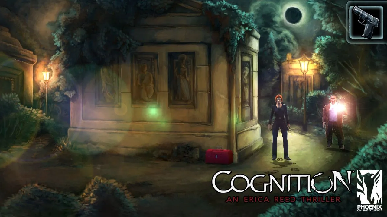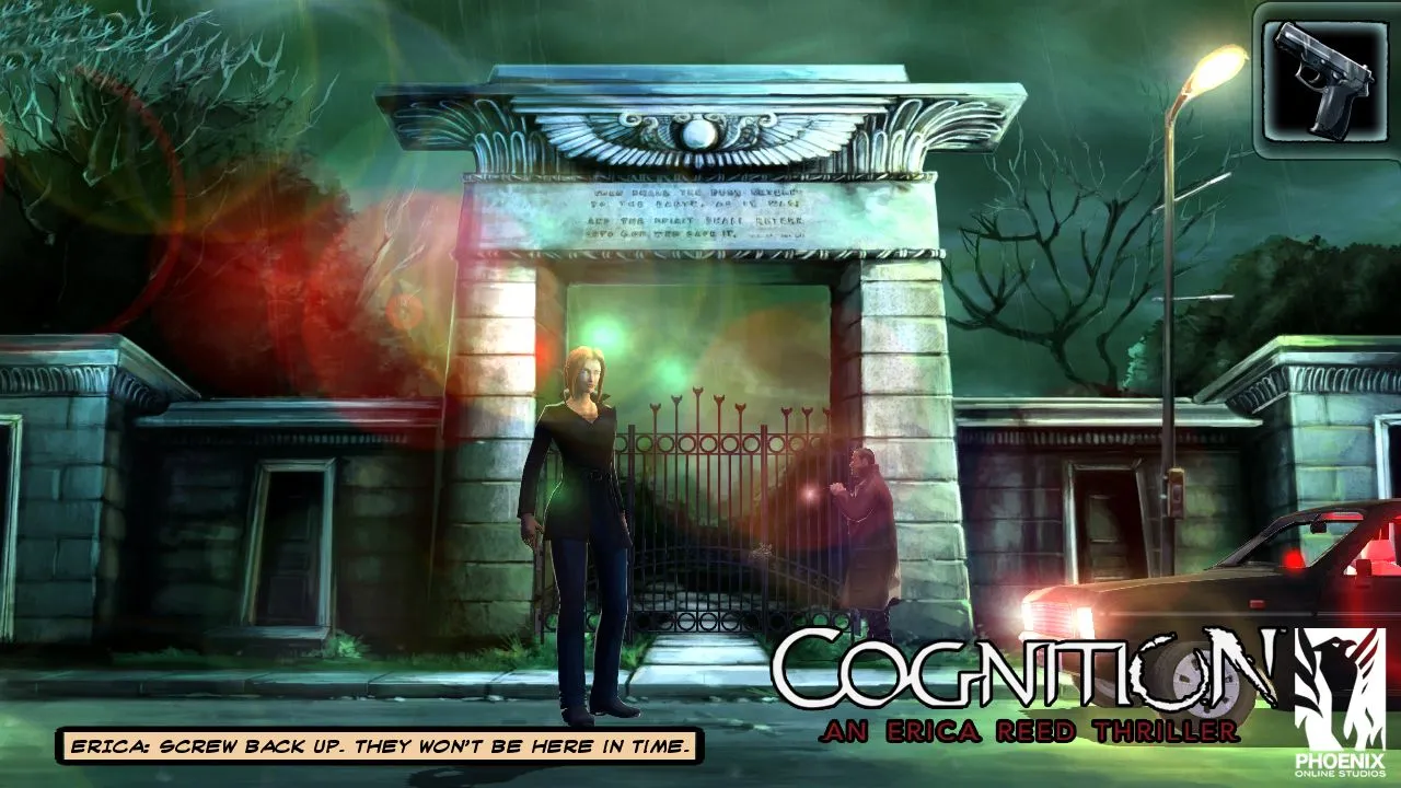 Erica and John spot a set of muddy footprints in the middle of the cemetery. Players can use Erica’s supernatural post-cognitive abilities to touch objects of interest and divine useful info. Touching the footprints causes Erica to see a vision of a shadowy figure walking behind a mausoleum. Armed with the useful hint, Erica checks behind the tomb only to have another vision of the same figure burying something in the soft earth. Spotting a bright red tool box, Erica snags a hammer from inside. Later she uses the hammer to free a shovel from the hand of a marble angel statue. Touching the freed shovel prompts another flashback of the Cain Killer dragging Scott into the mausoleum. Phoenix Online says Erica will also have access to other abilities like synergy, which allow her to combine objects to view specific past events, or regression, which she can use to influence peoples’ memories. Both of which should come in handy for a hard-headed FBI agent.