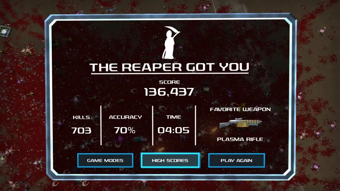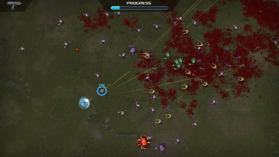 Calling Crimsonland an ugly game is a stretch. It features a smooth framerate, locks in a 1080p resolution, and features some cool particle effects associated with the weapons. But beyond this technical competency, the game art is incredibly bland. You fight a collection of generic zombies, bugs, and aliens on levels that are only a few embellishments away from being flat, single-color backgrounds. After making it to the second batch of levels, I was excited to see a road had been added to the background, which indicates just how sparse these environments look.