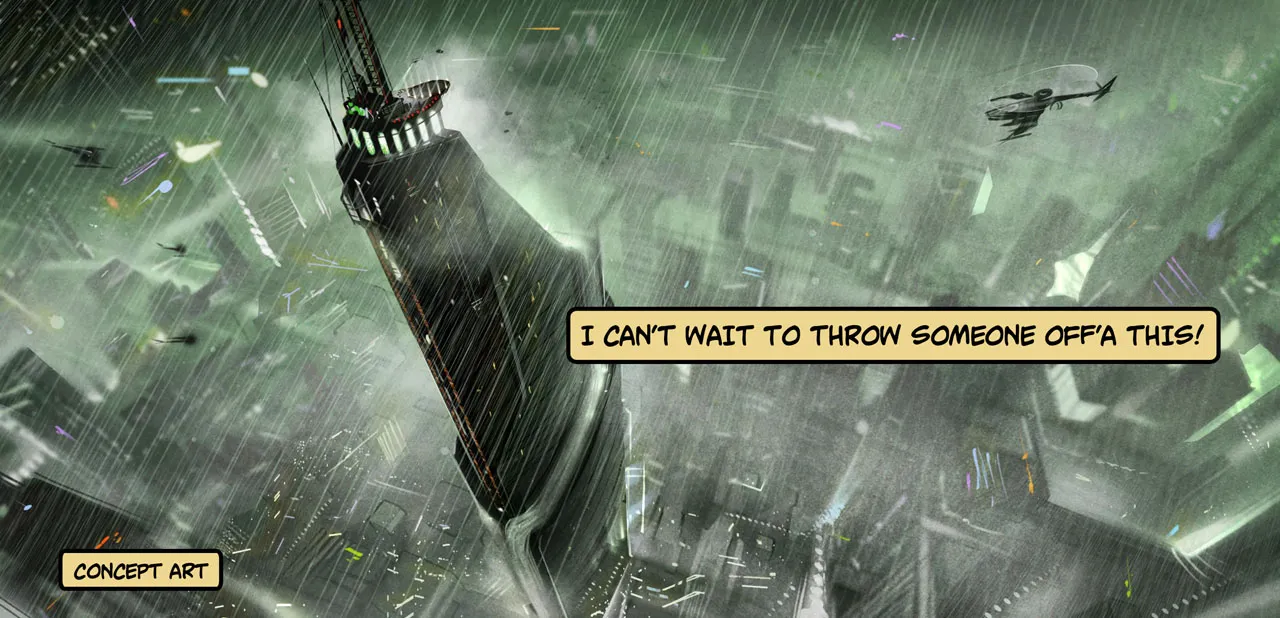 Deadpool knows he’s in a video game. After refusing to read the game’s script – opting instead to draw pictures of Wolverine and busty women on it – he dives headfirst into the experience High Moon Studios crafted, but he isn’t exactly a willing participant. He frequently breaks the fourth wall to communicate with the player, barking complaints about the gameplay, level designs, and mission objectives. When Deadpool loses interest or sees something he doesn’t like, his imagination takes control. The game changes to fit his immature, offensive, or twisted whim. In one stage, he replaces famed X-Man Cable with a big-breasted woman who is his biggest fan. Some of his changes draw the ire of High Moon Studios; the game director calls him on the phone to complain about spending too much money on a scene filled with explosions, death, mass destruction, and effects galore.