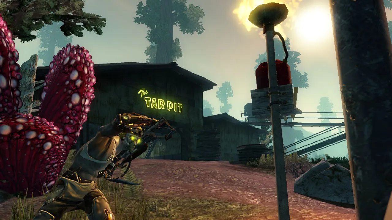 Later, the Trion employees demonstrating the game made their way to a decripit shantytown-looking place home to devious foes called 99ers: scavengers of alien technology so obsessed with their work that they implant themselves with their finds until their cyborg shells are barely human. Here, the group gets automatically assigned a mission to hack into sentry turrets and clear out the 99ers, which progresses over several stages and culminates with the enemies torn to shreds by their own defenses.
