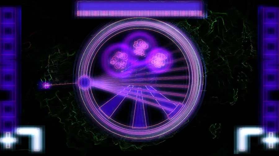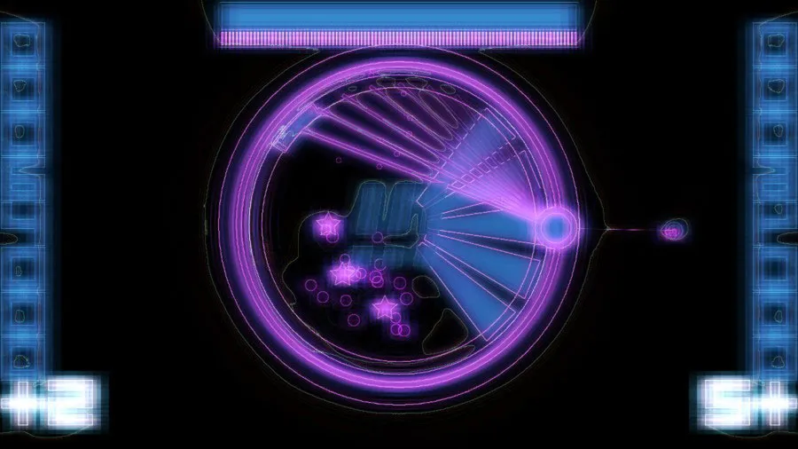 As you play, additional facets are revealed. First, red Xs appear. Cross your beam over those, and you lose any combo multiplier you’ve acquired. Xs and dots eventually move along tracks, and you have to assess their patterns and figure out the best way to approach. Later, you match dots by tapping them, or light up selected areas by spinning around the perimeter in a section that reminded me of Atari’s Tempest.