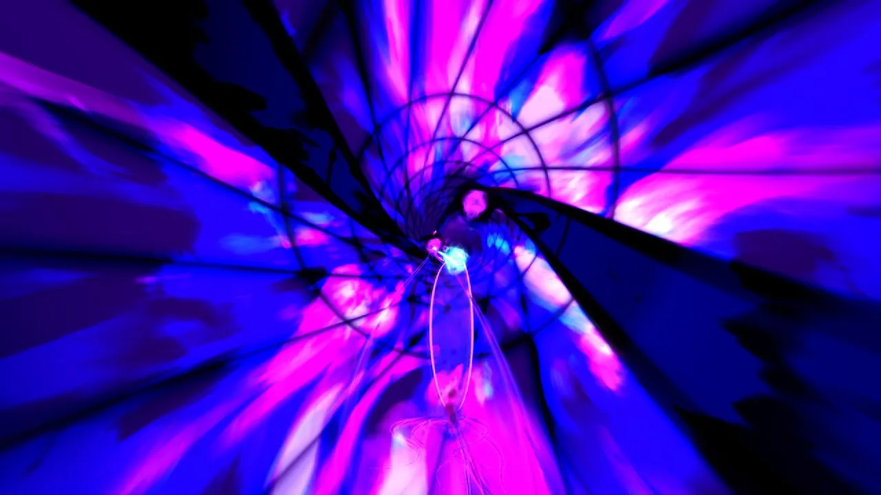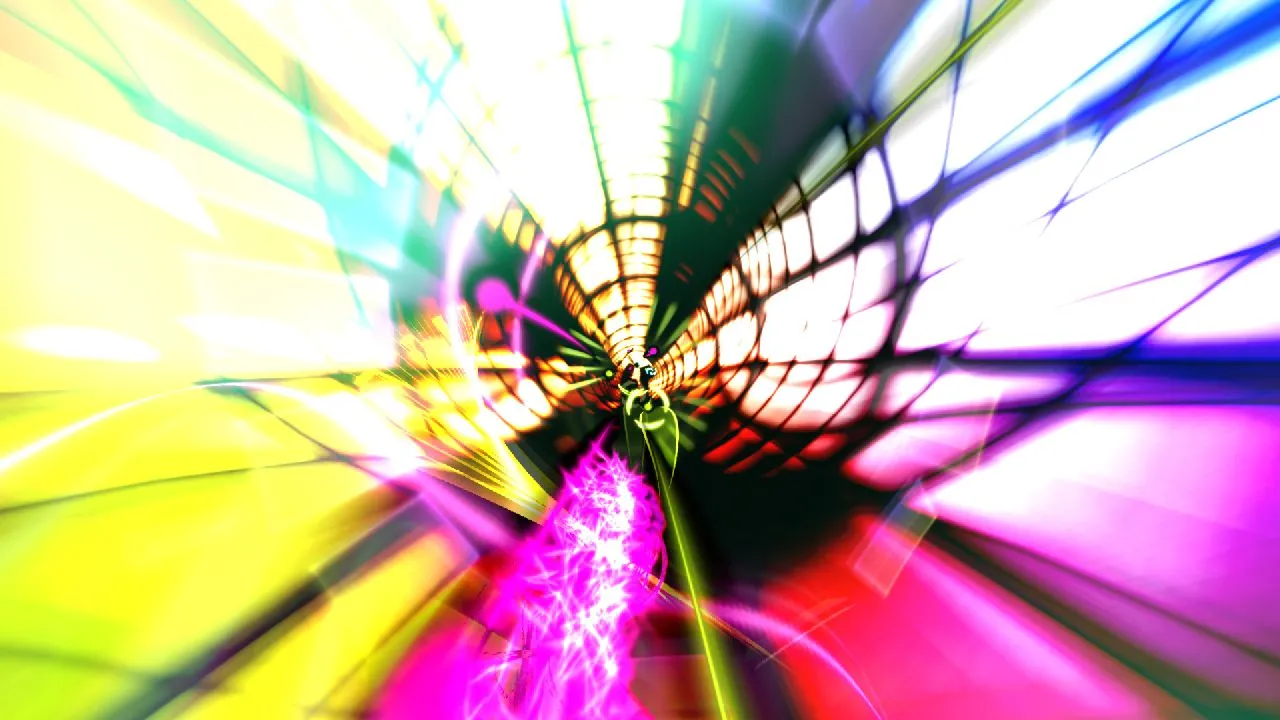 Dyad is a series of increasingly difficult challenges that ease you into a world of electronic trance music and wild visuals. Progressing from the first to final challenge is comparable to gradually moving from a wading pool to the sea in The Perfect Storm. The core concept involves rotating around an endless tube, Tempest-style.