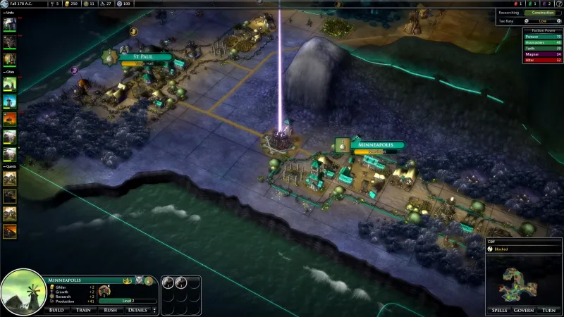 Unlike most 4X titles, Fallen Enchantress has very few city sites available for settling. Rather than consuming all the land around your capital until you run into another faction, you have to scout the wilderness (which means surviving the monsters and bandits that infest it) to find suitable locations. As your armies grow in strength, you are be able to clear out more territory and at least gain access to its strategic resources by building border-extending outposts, but taming the wilds is a big part of the early game. This has the side effect of dampening early tension and conflict with rival factions as neutrals typically impede any possible attack routes, which is a mixed bag – being left alone to develop in peace is nice and all, but losing the urgency of a possibly hostile neighbor reduces dramatic tension.