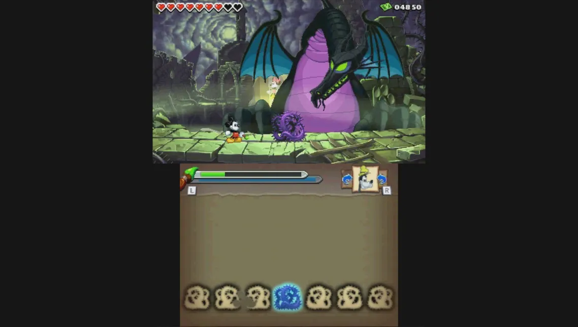 The main offender is the forced painting and thinning mechanic. At first, it’s not too offensive. You trace a drawing on the touch screen to make platforms and other objects appear in the top screen. Similarly, you can remove objects in the top screen by erasing images with the stylus. It soon becomes positively frustrating after you have to stop what you’re doing every 10 steps to doodle and then wait around while Mickey shoots paint or thinner to make the object appear/disappear. Imagine if you had to sketch in every barrel cannon in Donkey Kong Country before launching yourself around the level. Then, the cannons disappear after shooting you a couple times so you have to draw them in all over again. You can’t even choose where you place platforms or decide what shape they’ll take. There’s a pretense of creativity implied with painting that never rings true here.