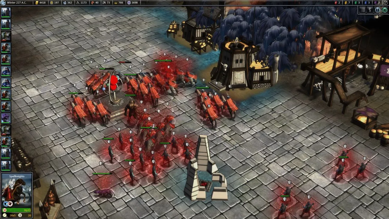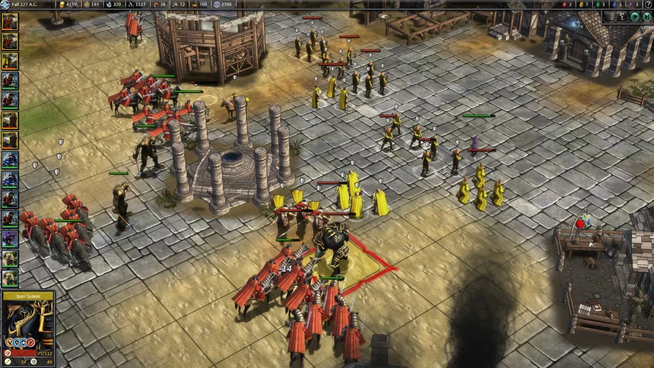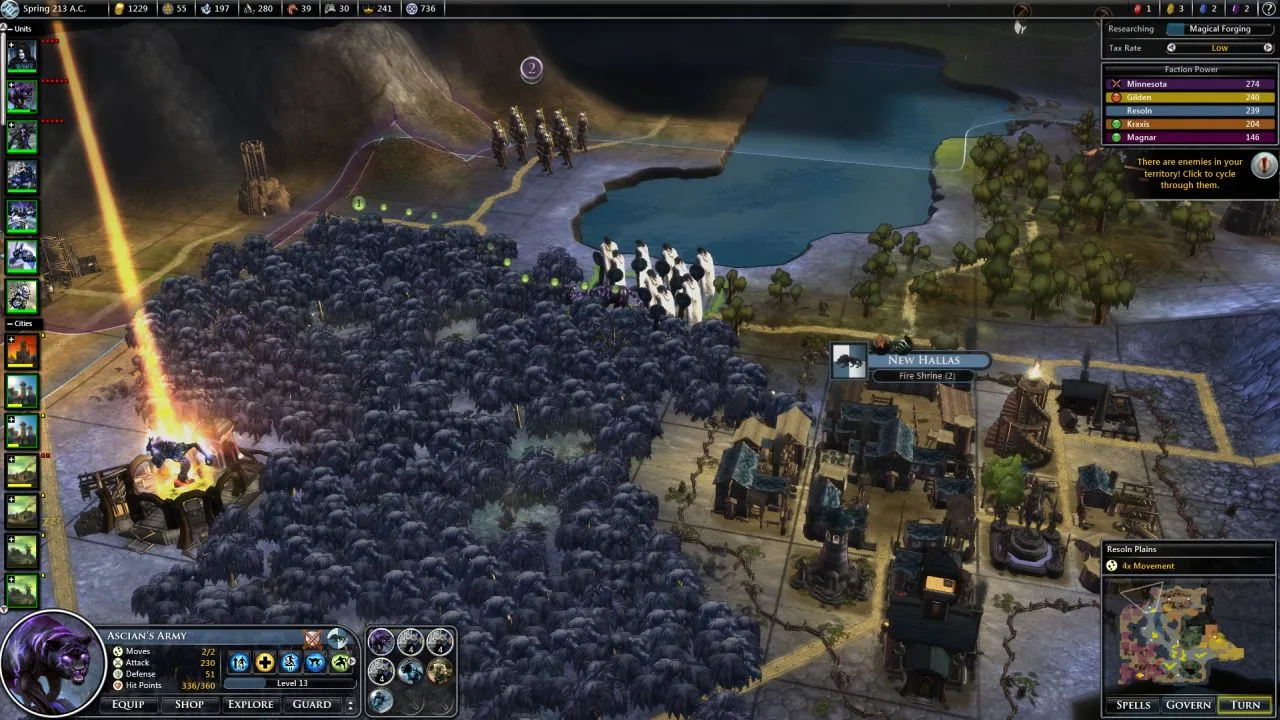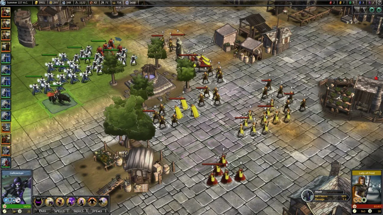 Combat has undergone the most dramatic change, and not just because it's the flashiest part of the game. I've conquered empires and slain elemental lords with a variety of strategies, from summoned monsters screening ice-flinging mages to armored footmen grinding the enemy down through sheer endurance. Several improvements combine to take it from the largely trivial sideshow of Fallen Enchantress to a legitimately interesting tactical puzzle. Redesigned battlefields offer chokepoints that create meaningful decisions about unit placement. Abilities from weapon-specific attacks to hero-cast spells offer more interesting wild cards that are better-balanced than before. Rebalanced attack/defense values and the swarm mechanic (which gives bonuses for surrounding your enemies) make it nearly impossible for a few heavily armored units to slaughter entire armies without taking losses, which was a serious problem in the last game. The ground-up reworking of units, weapons, armor, spells, and everything else is a massive success that gives players real choices in how they approach building and commanding armies to a level far beyond that of the last game.